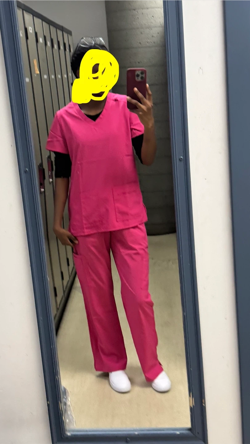 A v-neck scrub top and matching scrub pants in a vibrant pink colour. It's a comfortable and practical set for work. The set includes a top with pockets and matching drawstring pants.