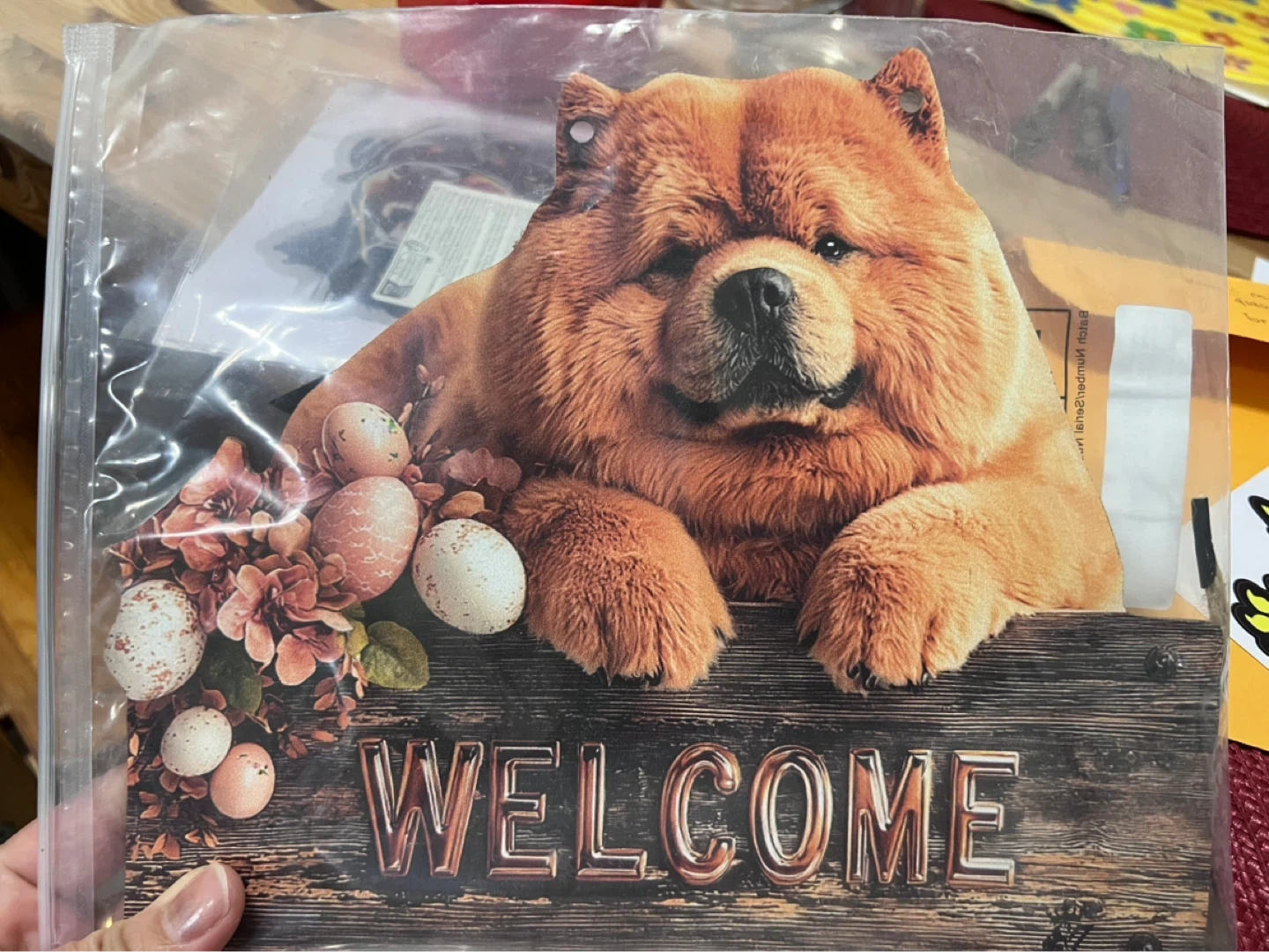 A charming wooden welcome sign featuring a fluffy Chow Chow dog. It measures 9.8 inches wide by 8.3 inches tall, with a thickness of 0.3cm. This sign's design includes a floral accent with eggs, perfect for adding a touch of warmth to your home's entrance.