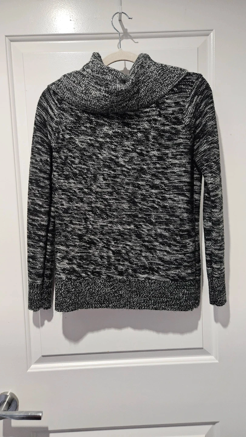 Size medium cozy cowl neck sweater in a textured knit pattern. It's made from a blend of materials for comfort and warmth. Looks great with jeans for a casual outing!