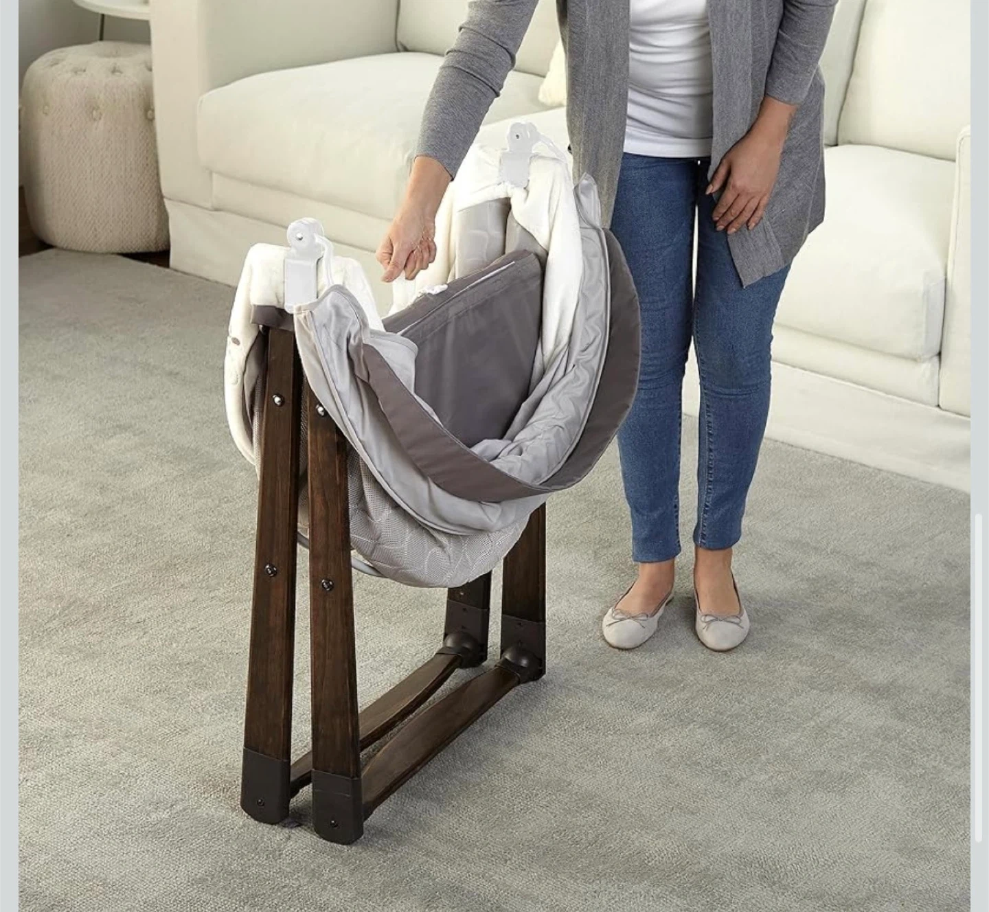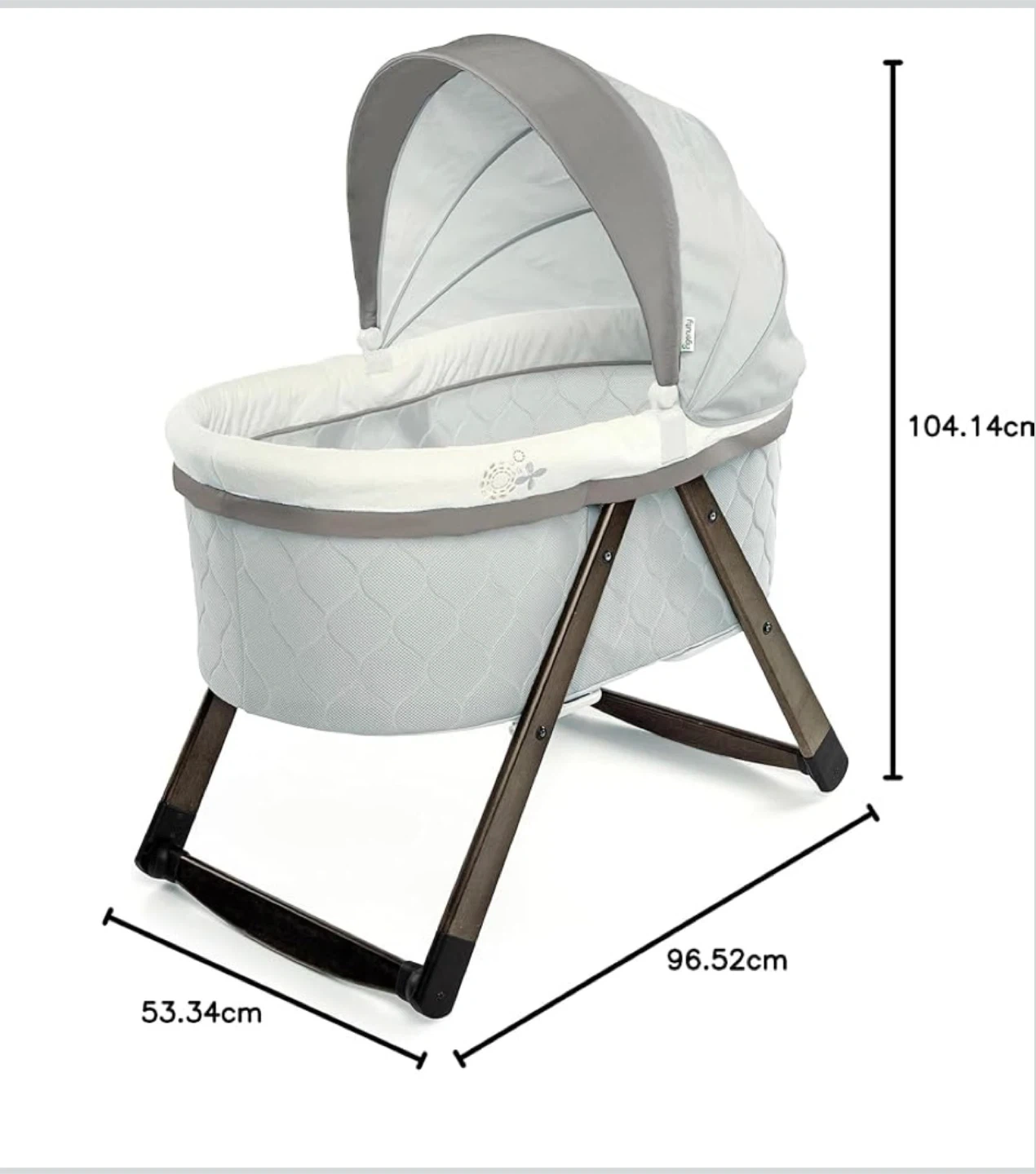 This bassinet is designed for newborns. It's foldable for easy storage and transport. The fabric is removable and machine washable for simple cleaning.