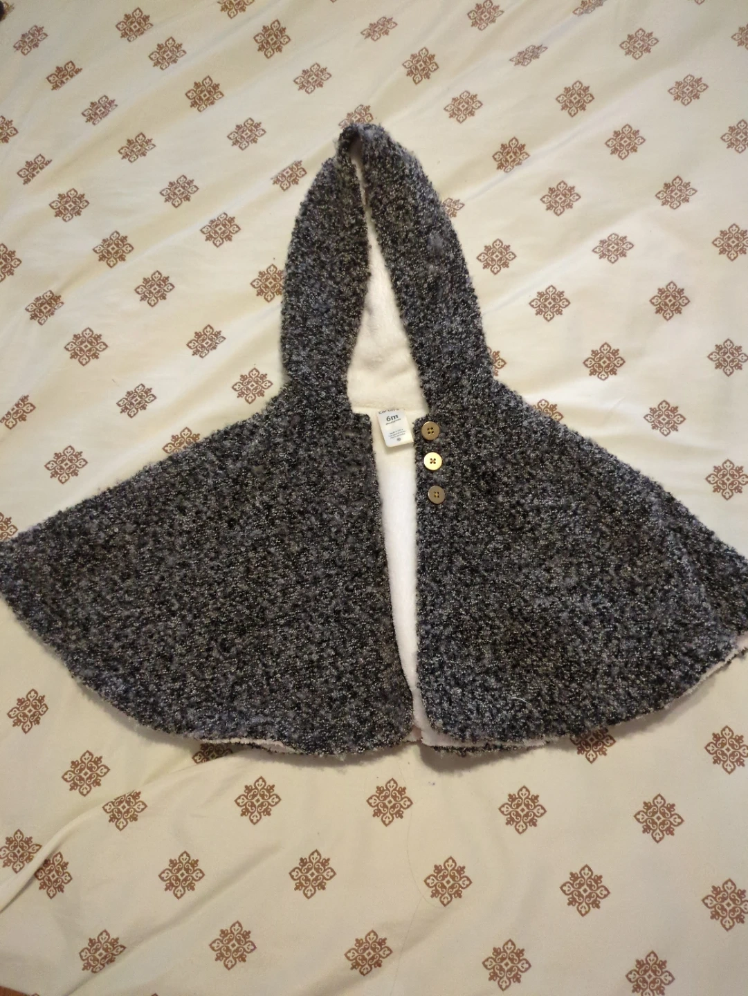 This Carter's hooded cape is in a charcoal grey marled fuzzy knit with a white sherpa lining. It fastens with two wooden buttons at the neck. Size is 6 months. It's perfect for keeping your little one warm on cooler days!