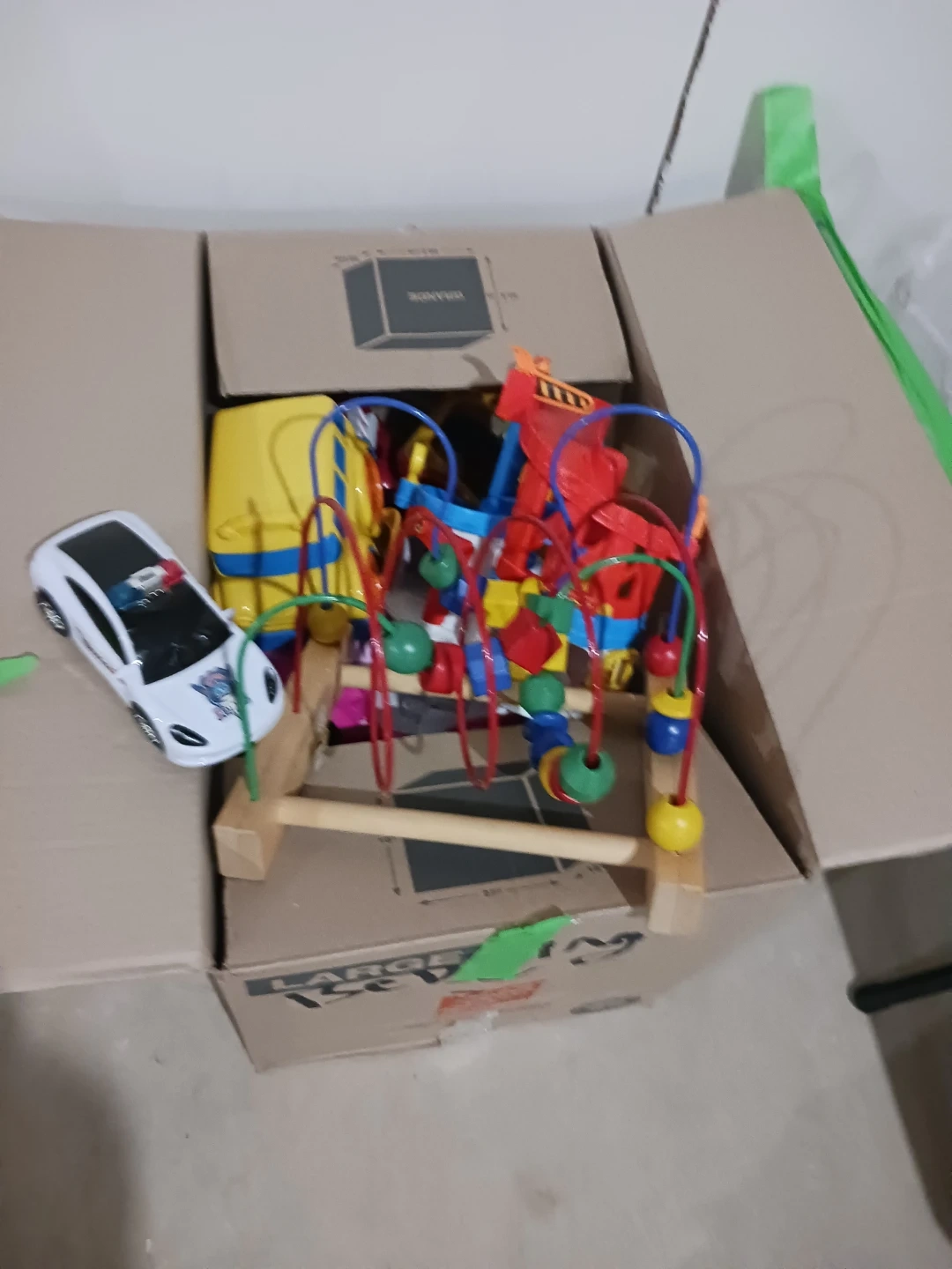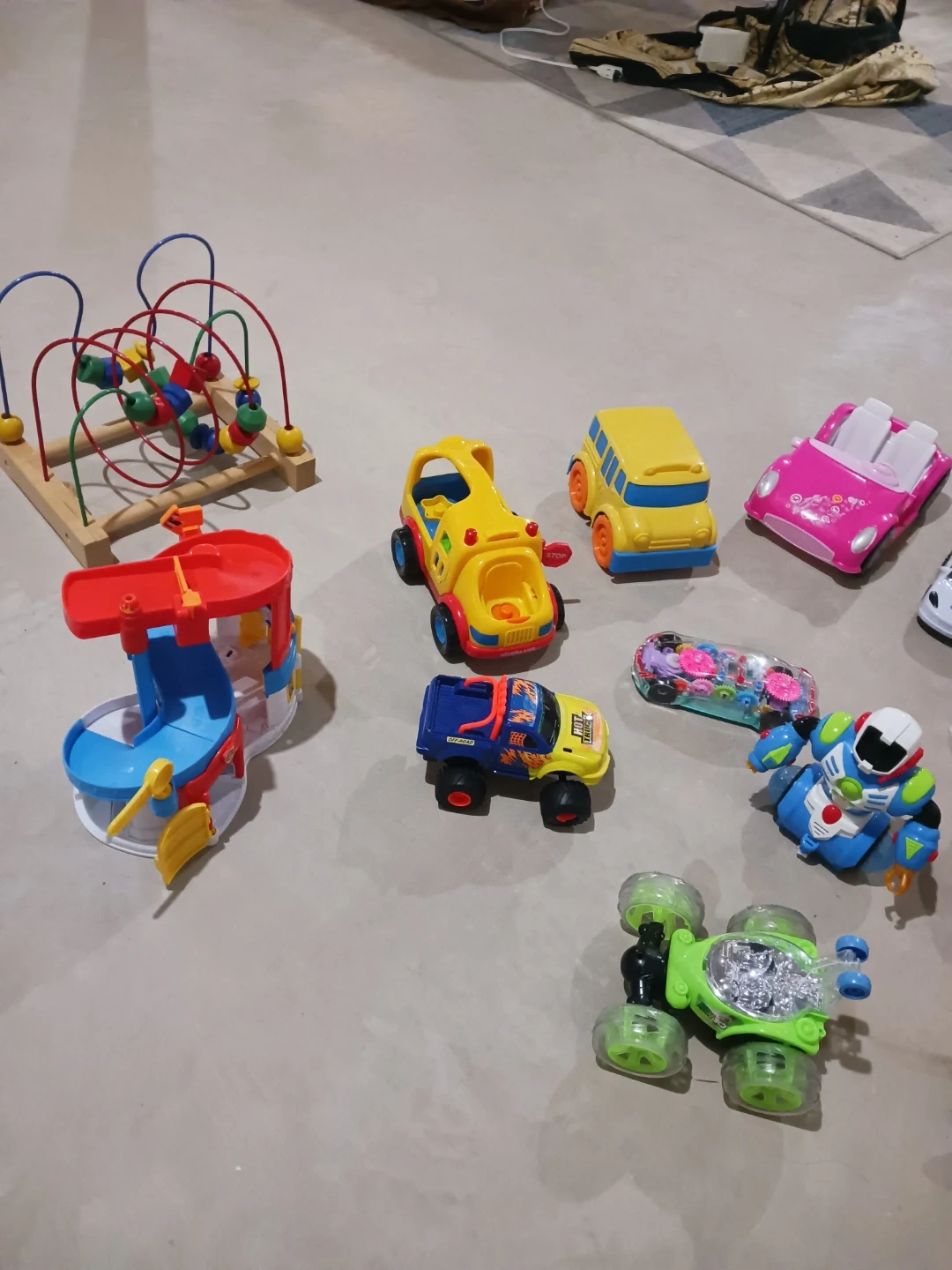 Includes a variety of toy cars, a fire truck, a robot, an airplane, and several action figures. Also features a wooden bead maze toy. Great for imaginative play!