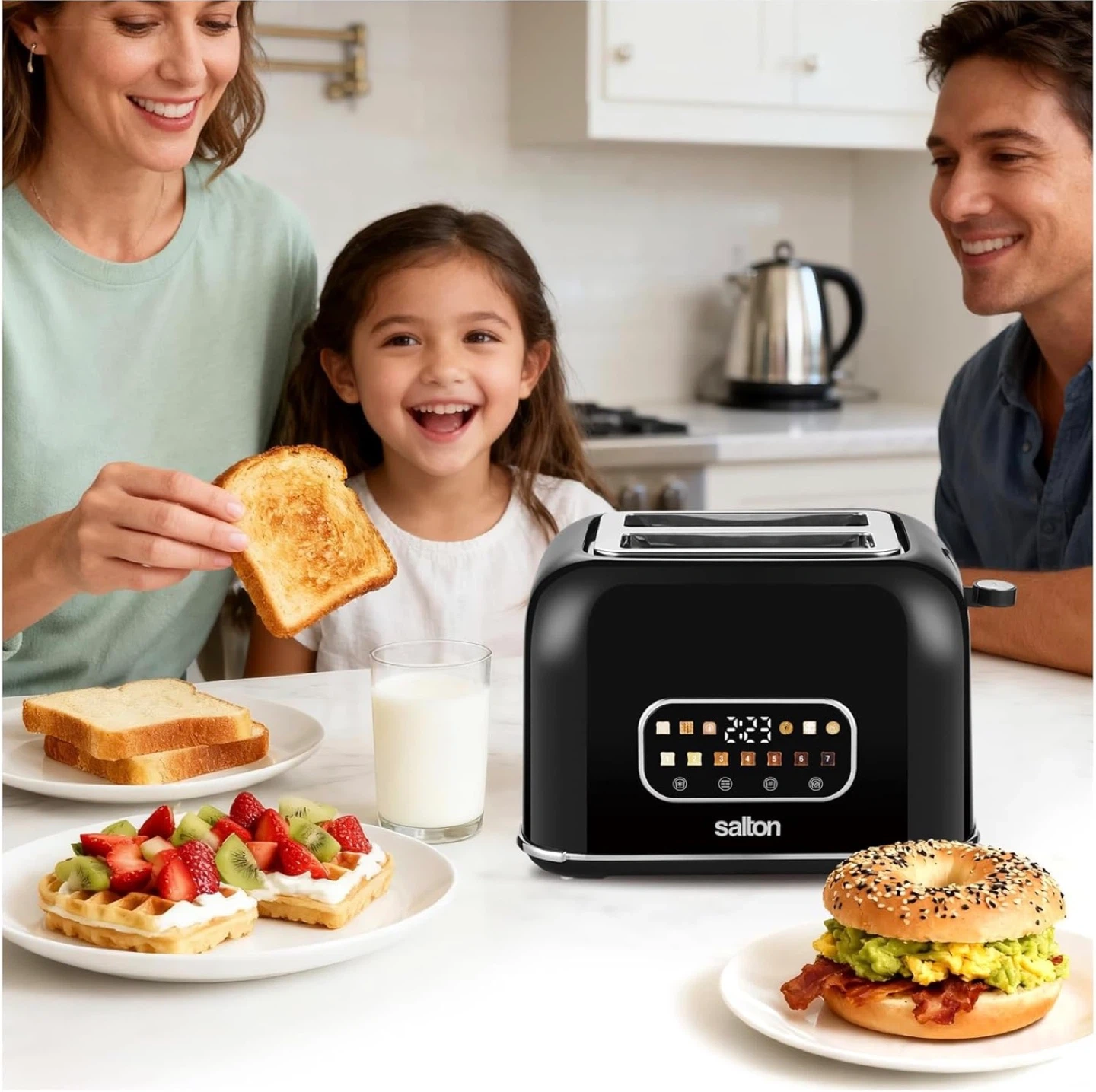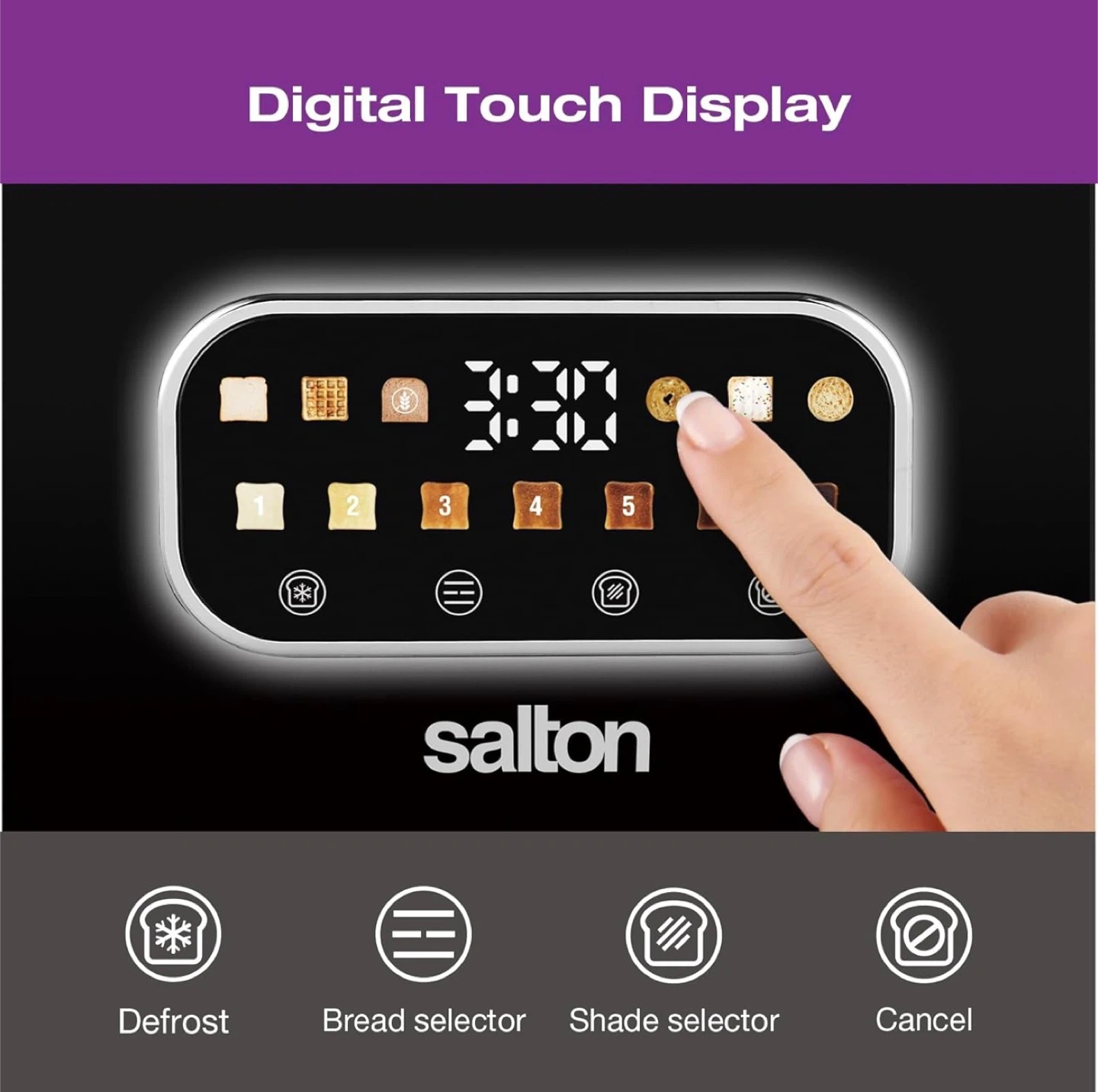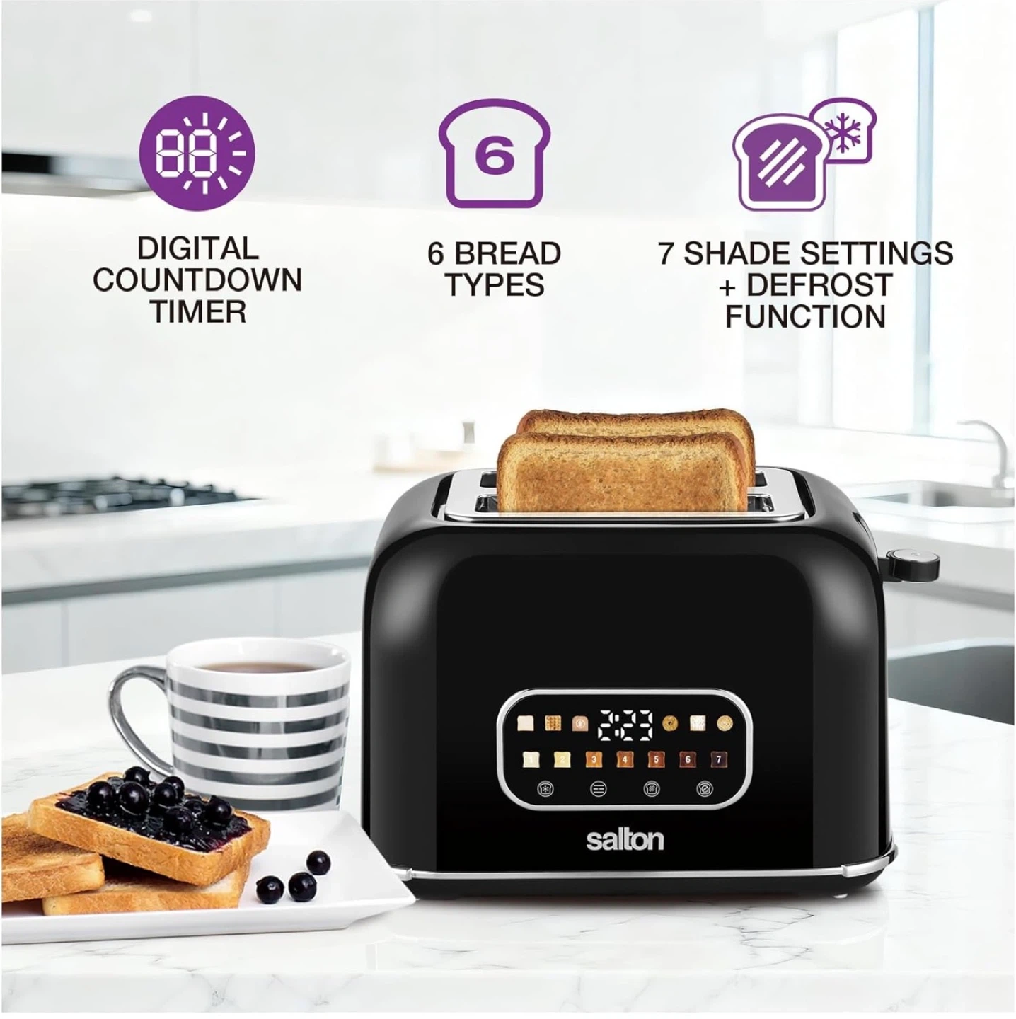 This Salton 2-slice toaster features digital touch controls and a countdown timer. It offers 7 shade settings and a defrost function. Multiple bread types are supported, including bagels and waffles.