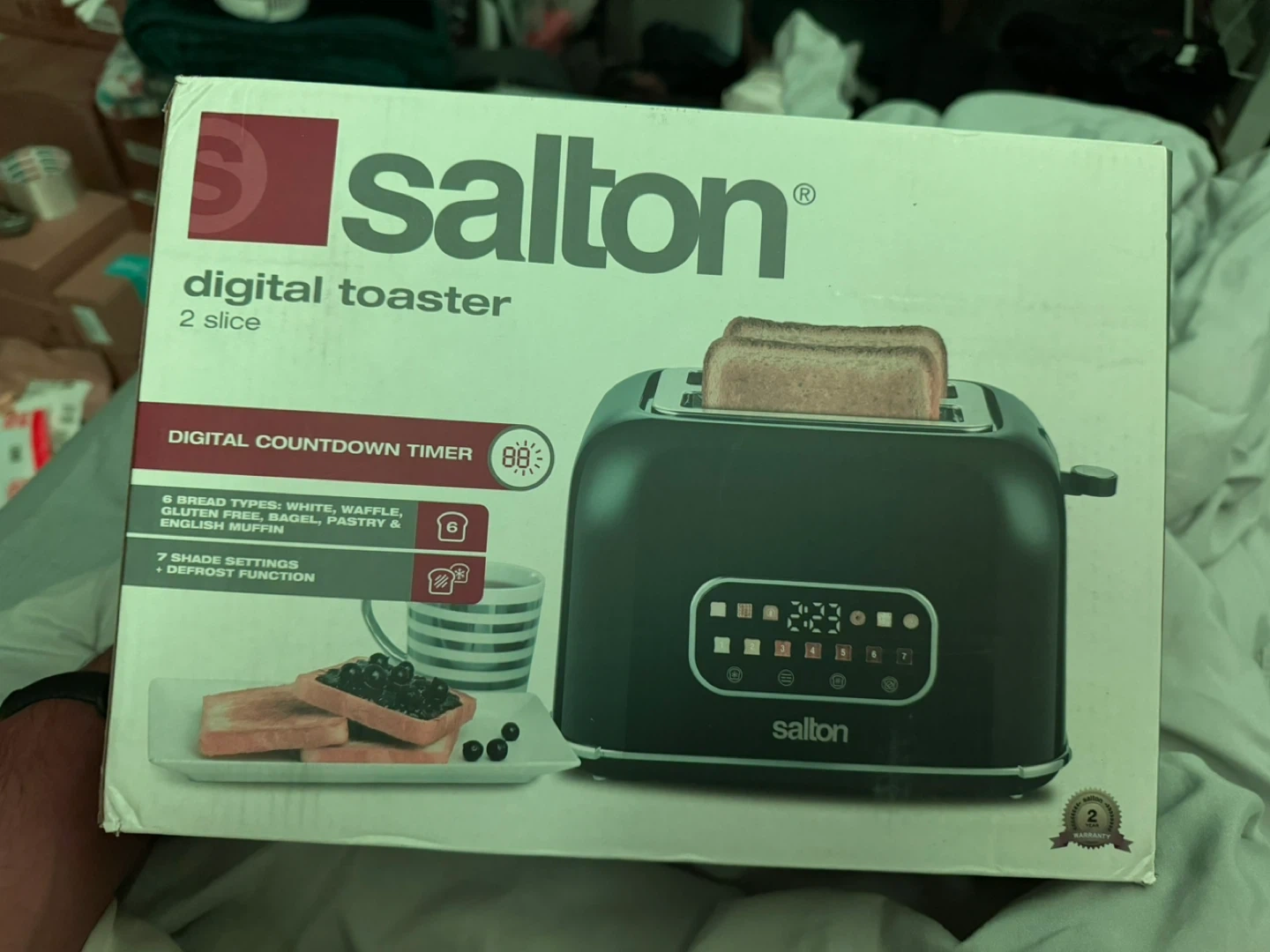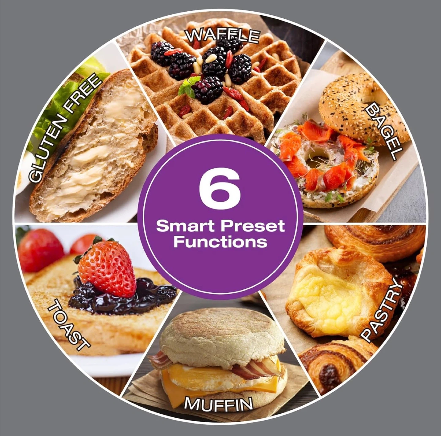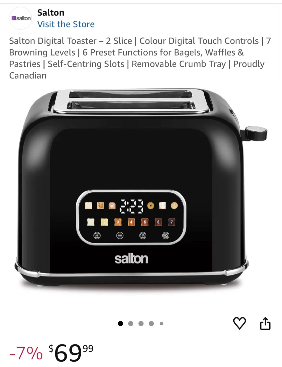This Salton 2-slice toaster features digital touch controls and a countdown timer. It offers 7 shade settings and a defrost function. Multiple bread types are supported, including bagels and waffles.