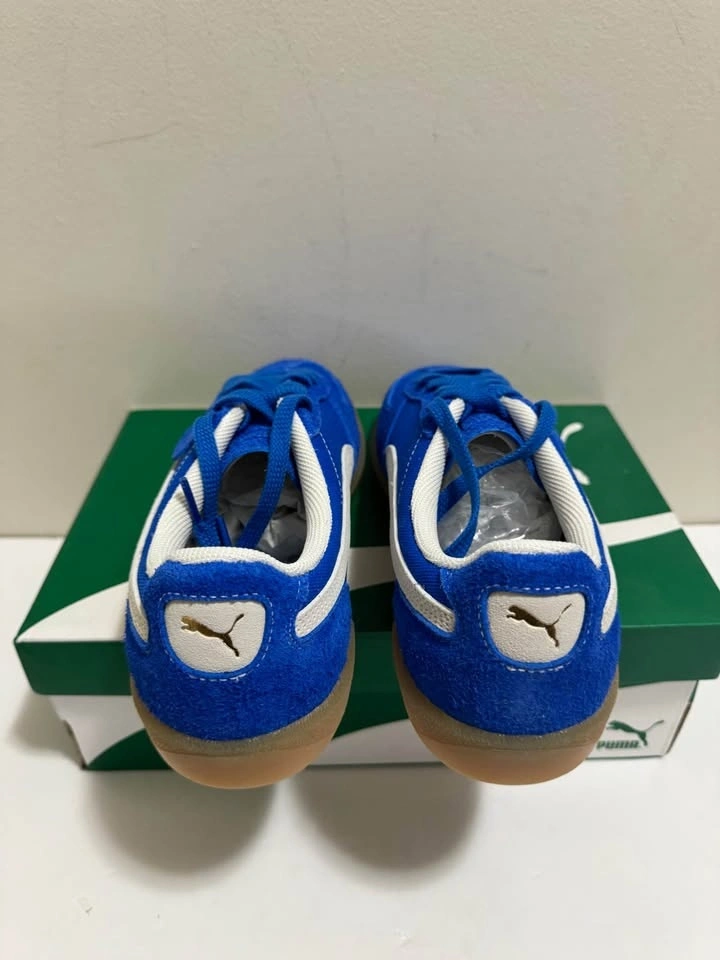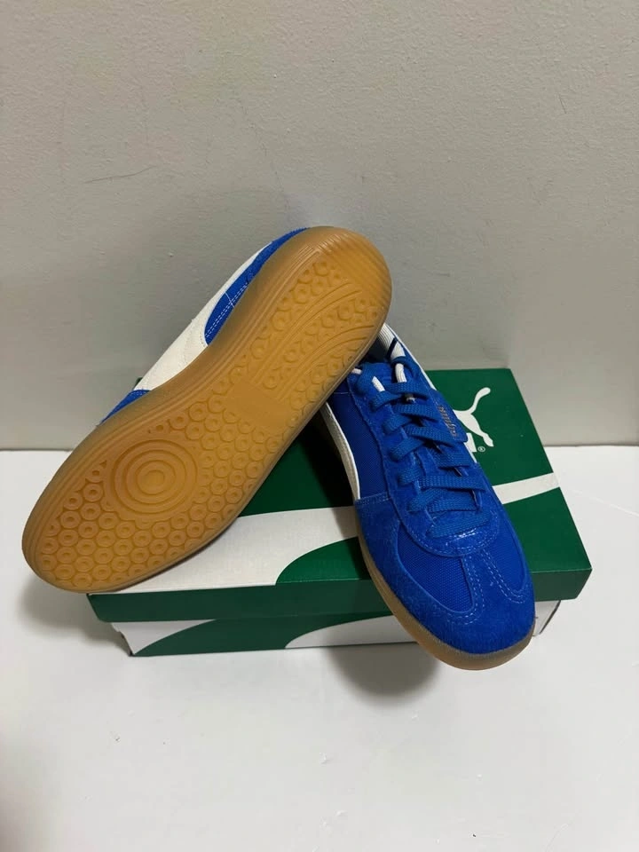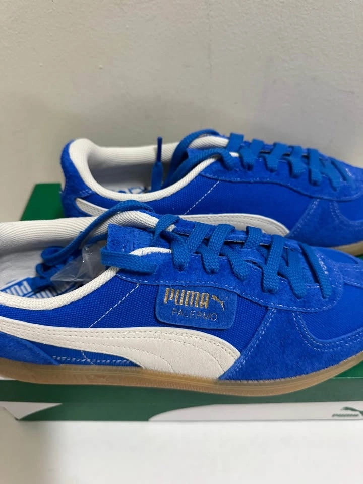 Vibrant blue Puma Palermo sneakers for sale. These kicks are made with suede and canvas, featuring a classic white stripe and gum sole. Comes with the original box. Pick up only. Located near Brampton Gateway Terminal and Shopper World Mall Brampton. Address provided upon pickup confirmation. Cash only.