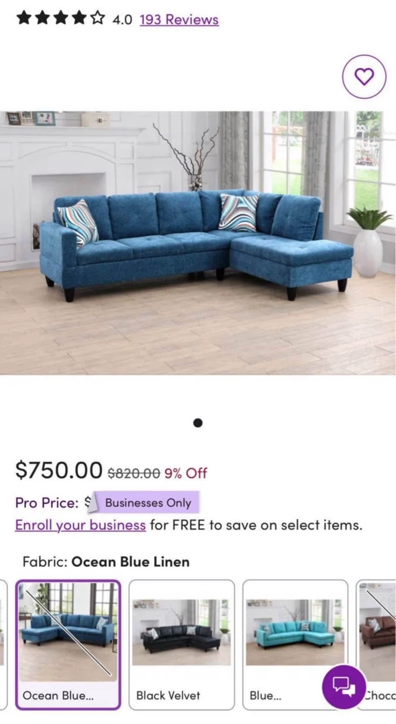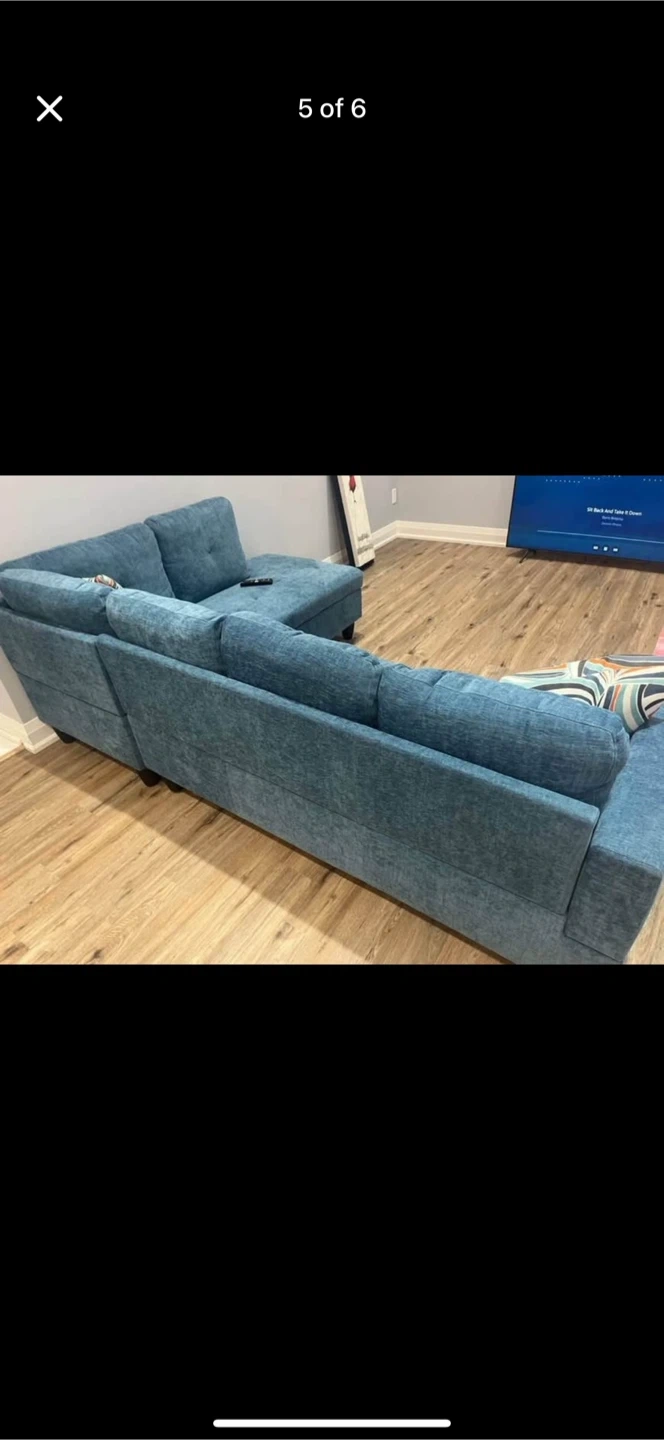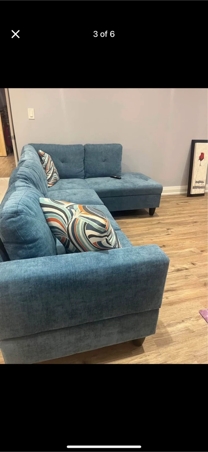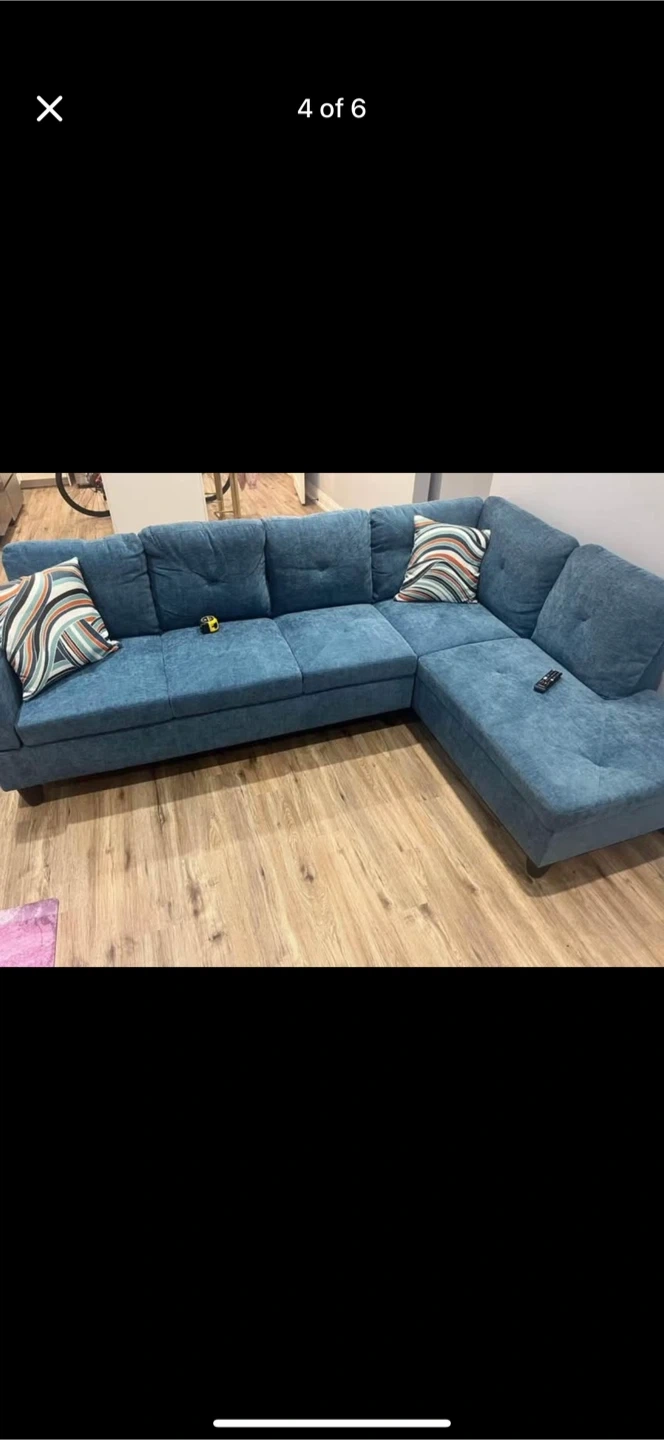 10Selling a comfortable sectional sofa in ocean blue linen! It's perfect for a living room, game room, or office. The chaise allows you to place down a tray of snacks or kick up your feet after a long day. Includes 2 toss pillows. Originally priced at $750