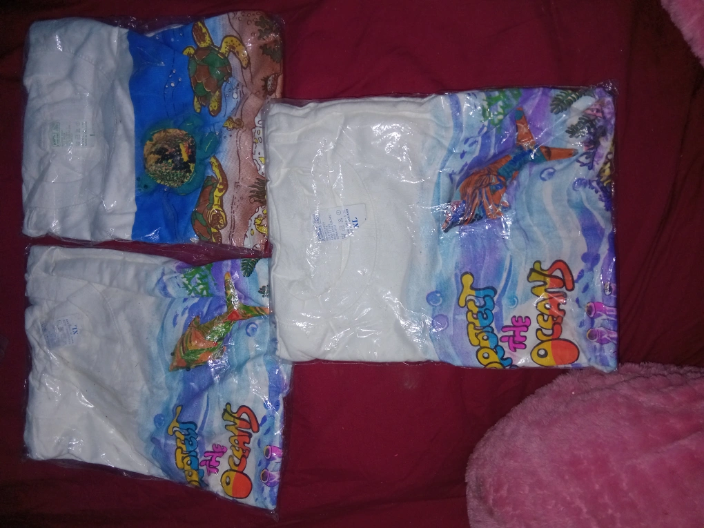 28I have a few ocean-themed t-shirts for sale! They are white with colourful ocean designs. I have one in size Large and two in size Extra Large. They are still in their original packaging! and come with a stuffed animal toy, they are $10 each or all 3 for $25