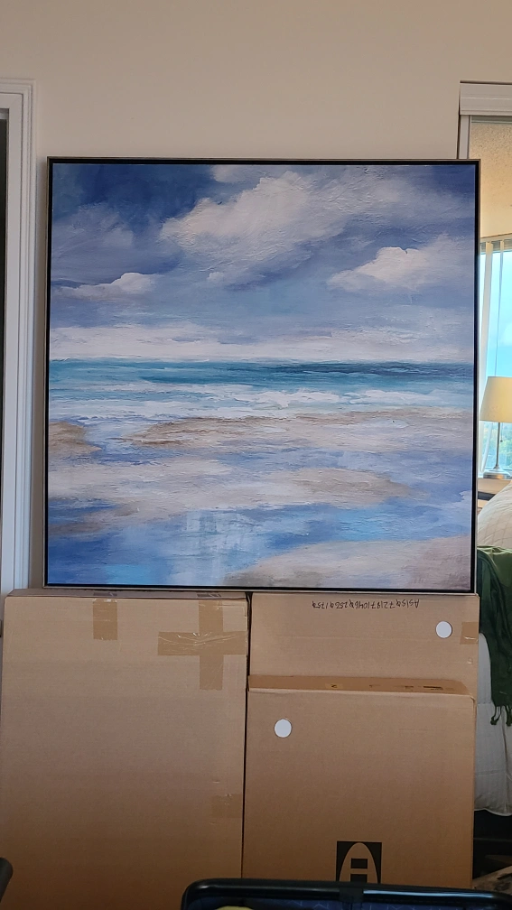 21Beautiful ocean view painting, perfect for adding a touch of serenity to your home. Warm, brushed silver-looking 4" thick frame.