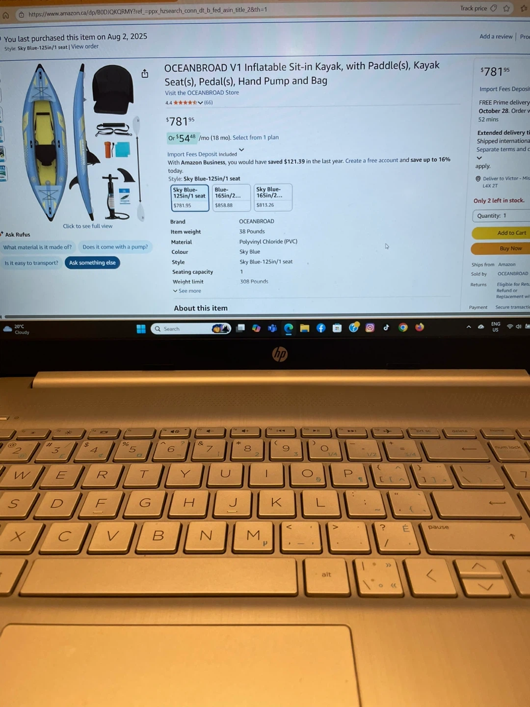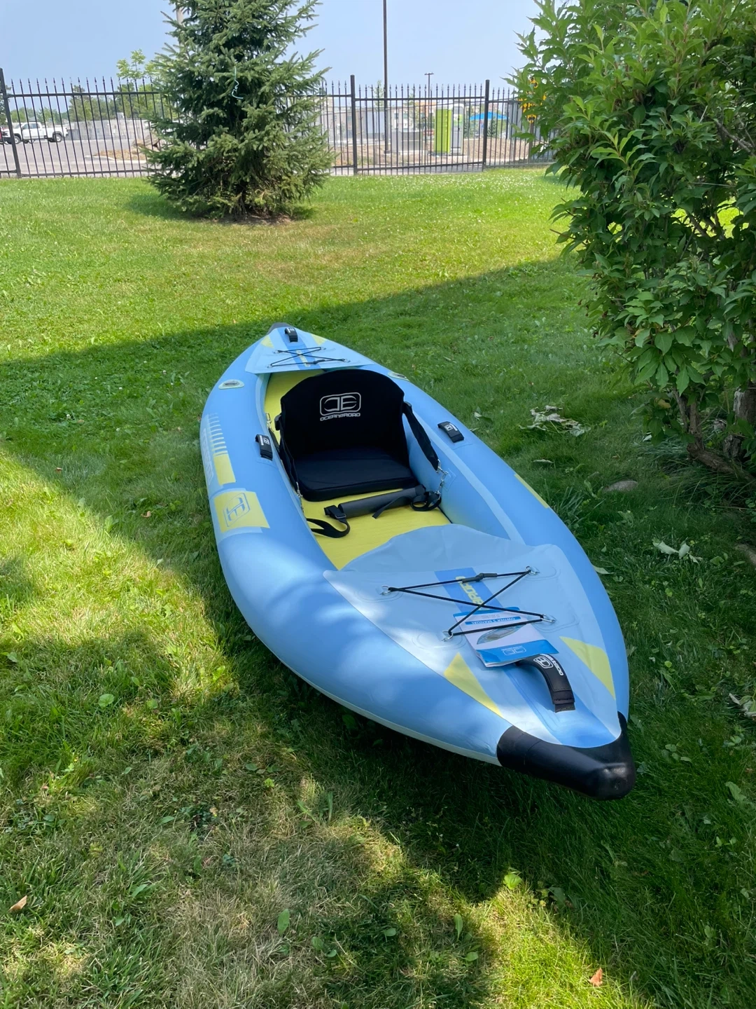 71Get ready for some fun on the water with this brand new OCEANBROAD V1 inflatable kayak! It's a sit-in style and comes in a cool sky blue colour. New, never used. Decided on a tandem kayak instead. Key features: - Includes paddle(s), kayak seat(s), pedal(s), hand pump, and bag - Dimensions: 125in length, 35in width, 9in height - Weight capacity: 308 lbs / 140kg - Paddle length: 86in - Carry size: 35" x 21" x 20"