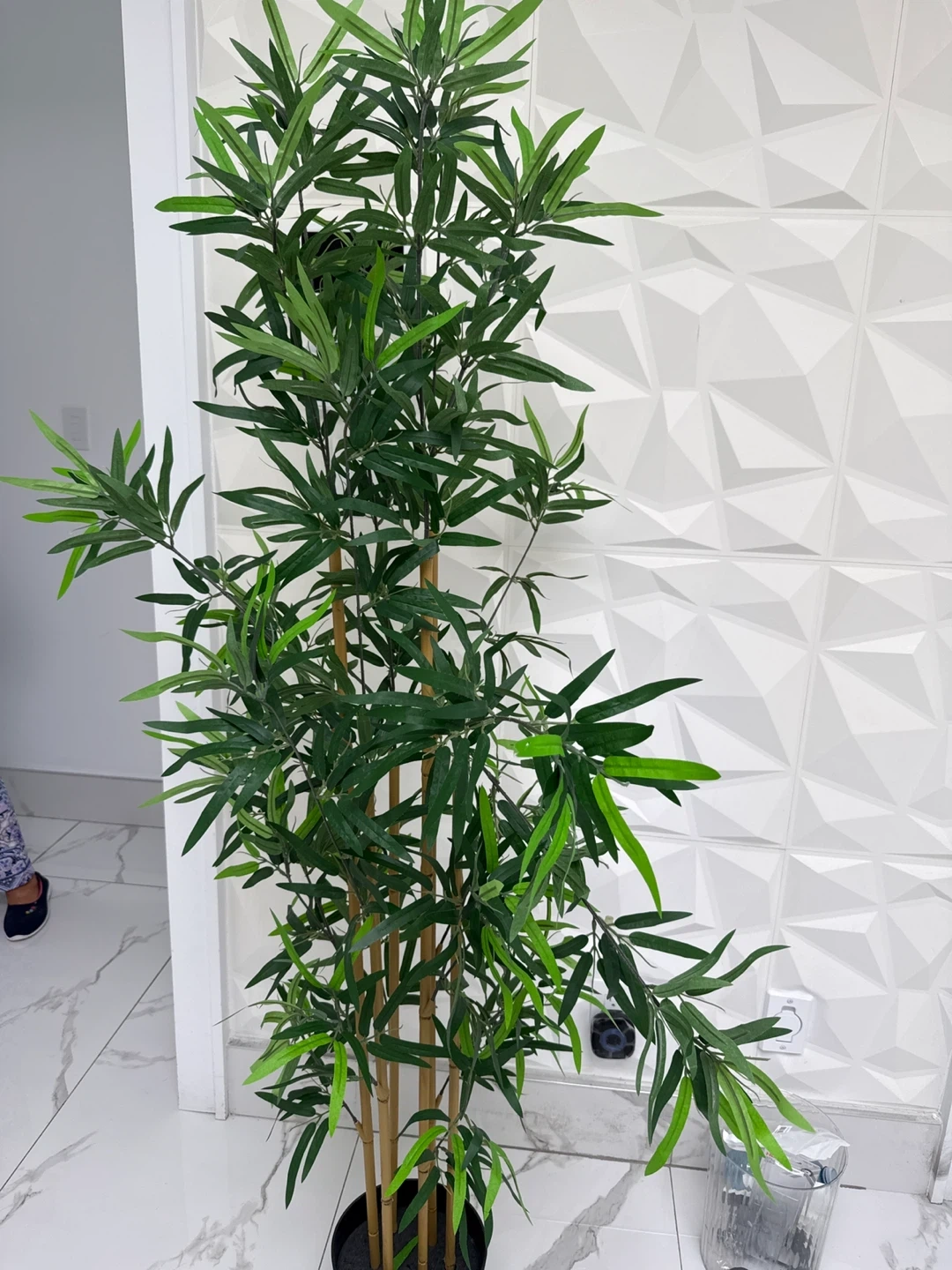 Tall faux bamboo plant with realistic green leaves. Comes in a black pot. It's a great decorative piece for any room!