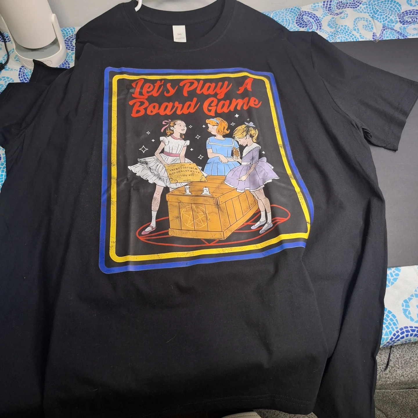 Black t-shirt in size 3XL. It's made of 100% cotton. The graphic features three girls playing a board game with a pentagram design. This shirt is great for people who like vintage or spooky aesthetics!