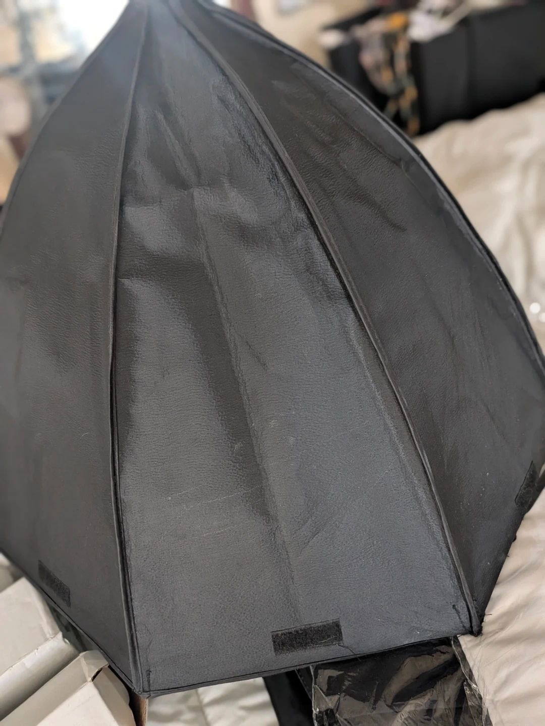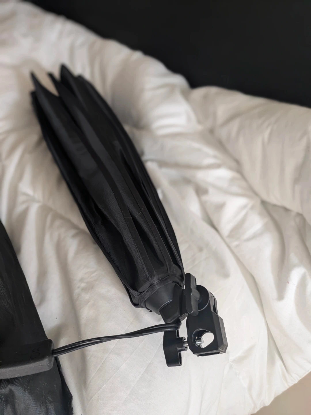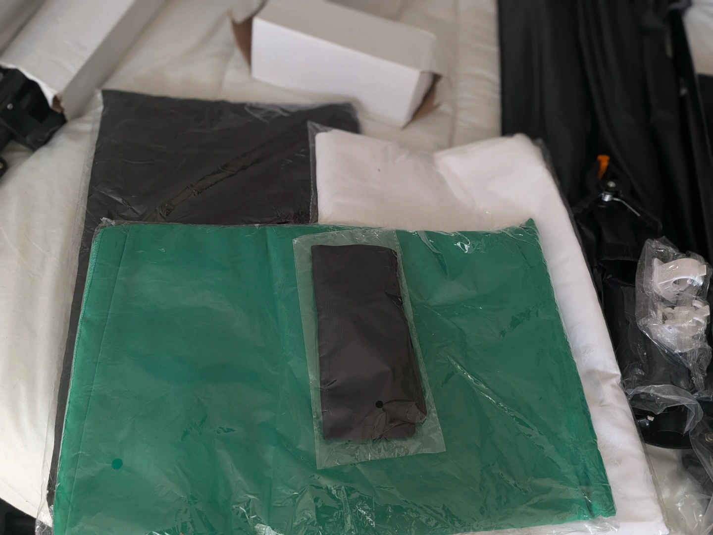 Complete photography lighting kit for your studio needs. It includes three adjustable light stands and two lighting umbrellas. The kit also comes with black, white, and green backdrops for versatile shooting options. Everything fits into a convenient carrying bag. Great for aspiring photographers! #Some LightBulbs are broken on the bottom of the bag
