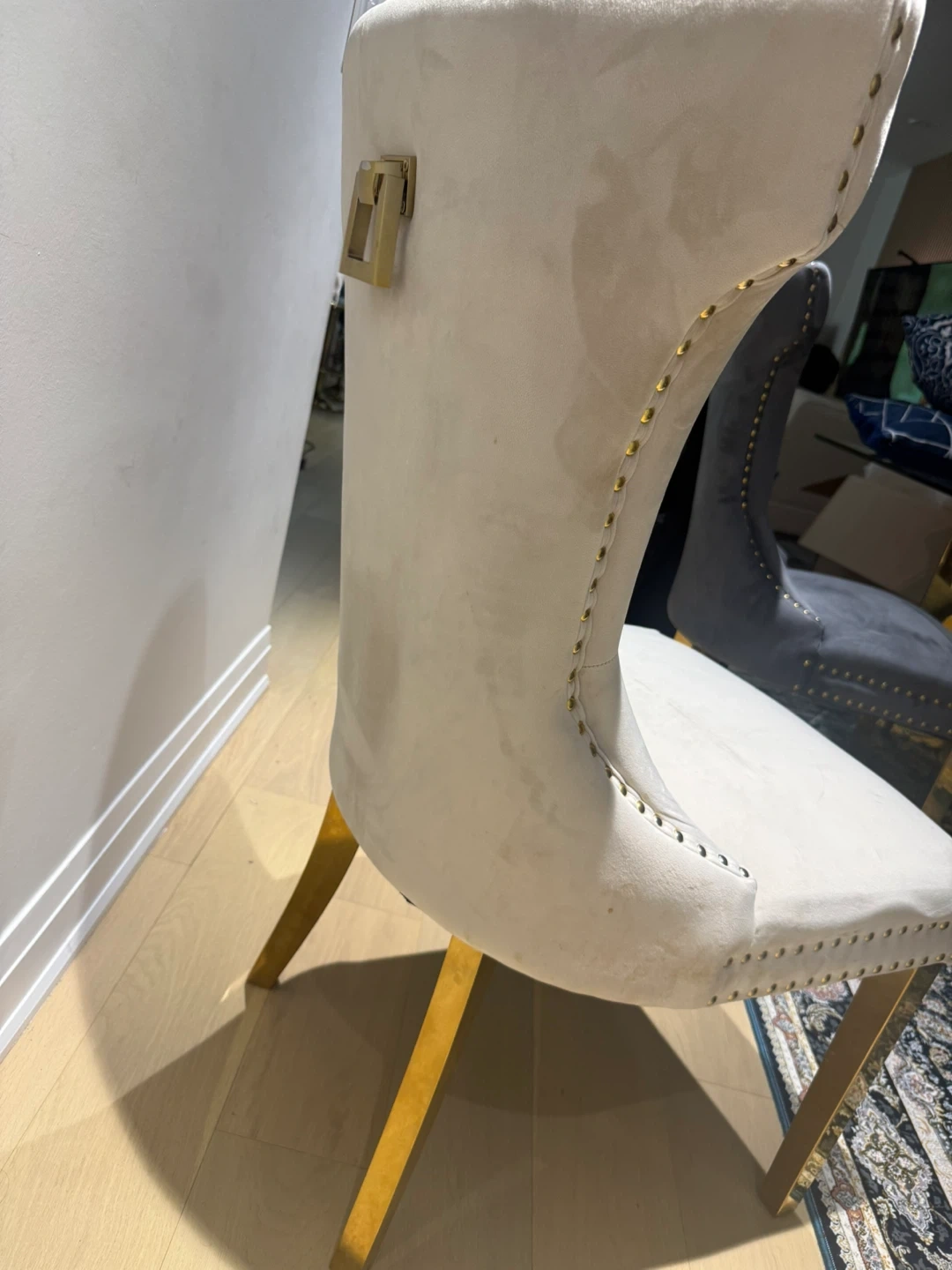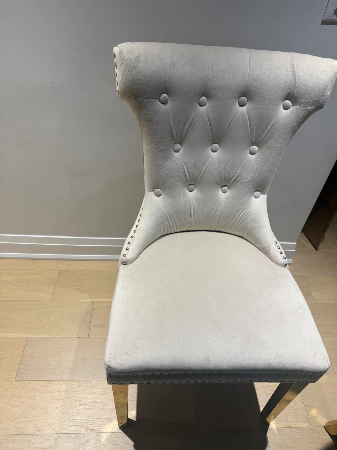Tufted velvet dining chair in a neutral beige colour. It's upholstered with a button-tufted back and accented with gold nailhead trim. Legs are gold-toned metal.