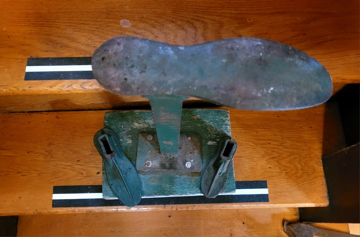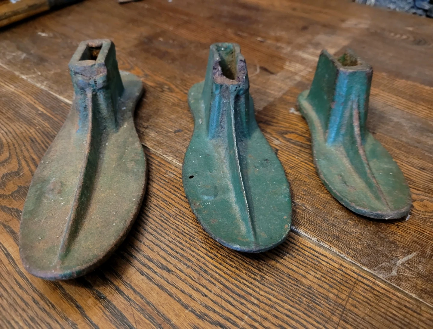Set of three cast iron shoe lasts and a shoe last stand. These sturdy vintage tools are made of cast iron with a green patina. They're great for cobblers or anyone looking for unique display pieces.