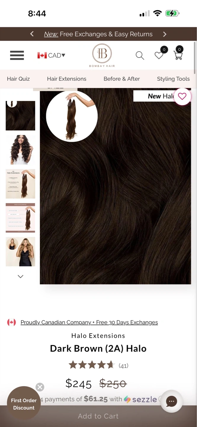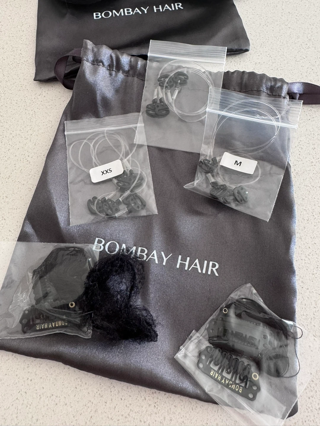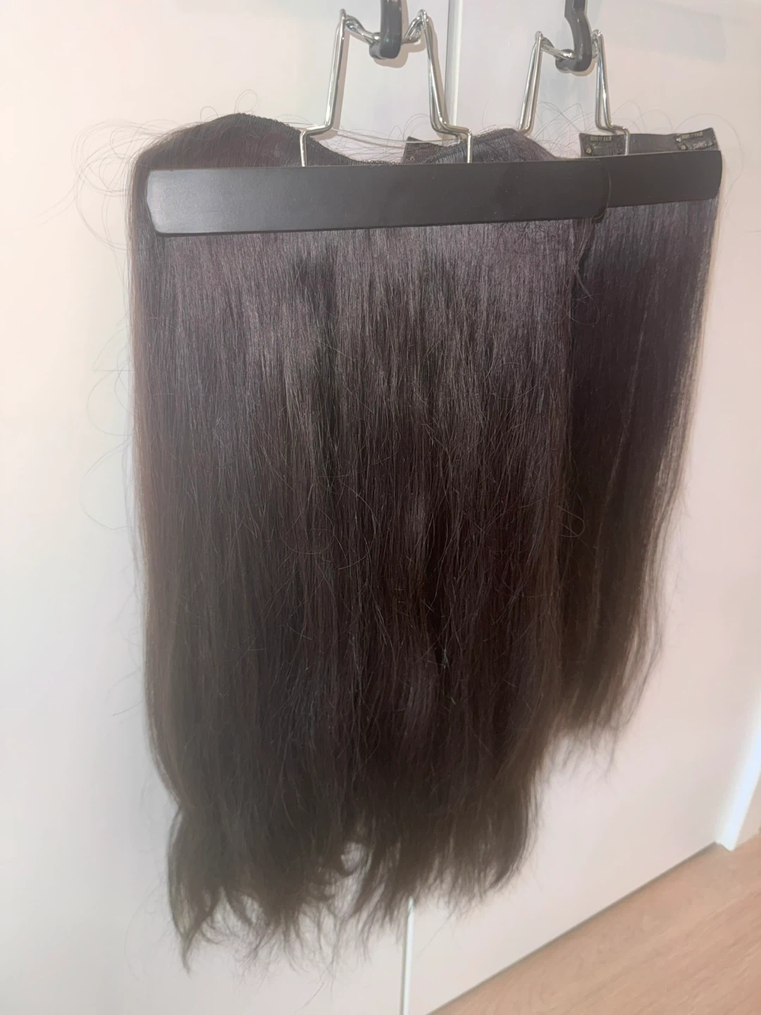 This is a set of Bombay Hair Halo Extensions in Dark Brown (2A) shade. Comes with various sized replacement wires and clips. It's made of high-quality synthetic hair. These extensions add instant volume and length to your hair!