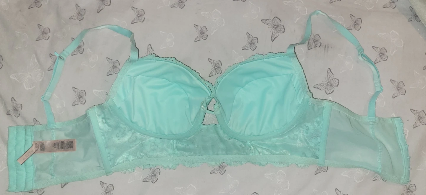 Victoria's Secret Dream Angels bra in a light blue colour. It's a 34B size. The bra features intricate lace detailing and some subtle rhinestones on the front.
