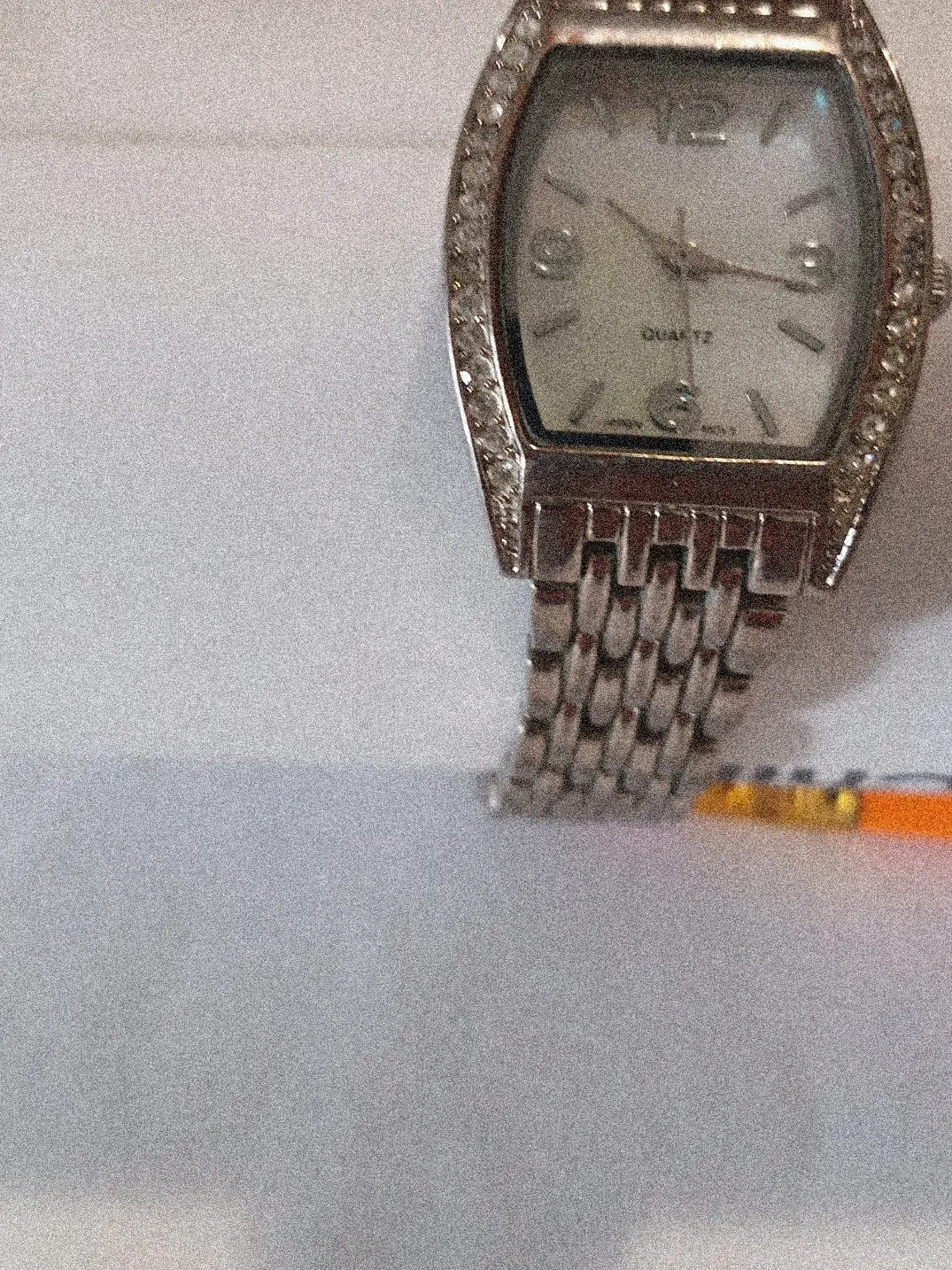 This is a women's silver-tone quartz watch. It features a dial with hour markers and a rhinestone-embellished bezel. The watch has a linked metal band. It's a stylish accessory for everyday wear!