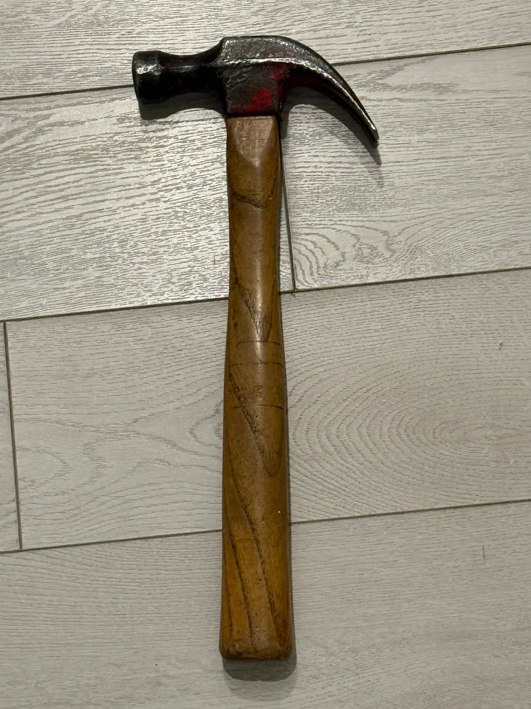 This is a standard claw hammer with a wooden handle. It's useful for driving nails and prying them out. The metal head shows some wear but is still solid. Great for general repairs and DIY projects!