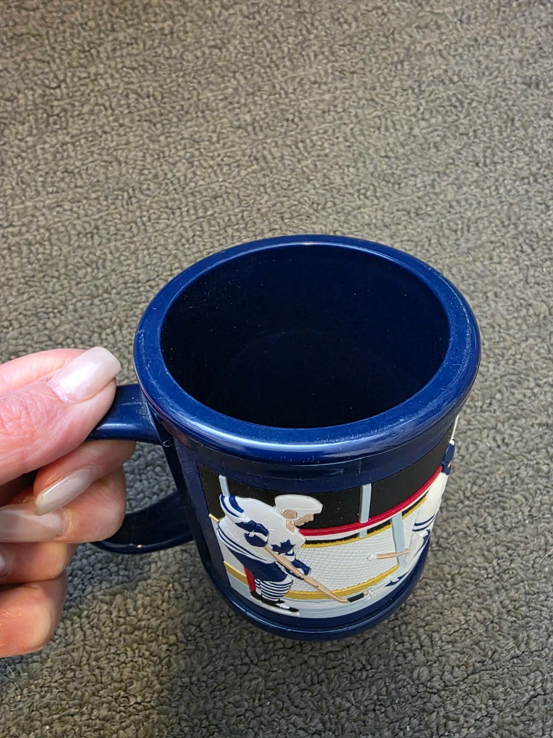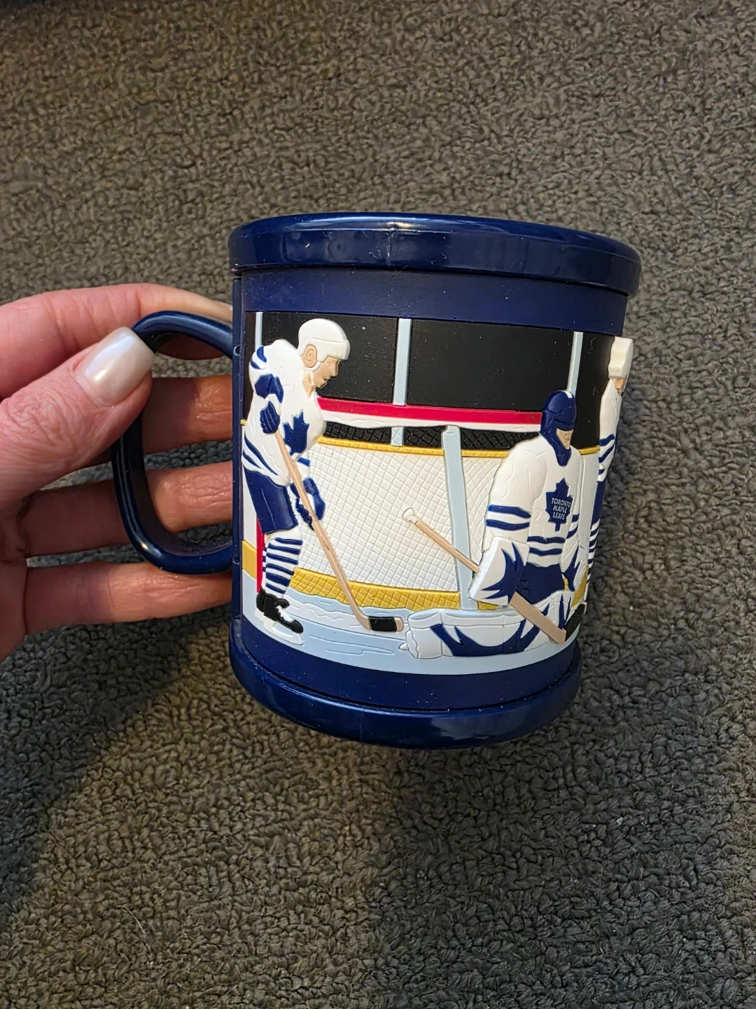 Show your team spirit with this navy blue Toronto Maple Leafs mug featuring "Jeremy" on the front. It displays a hockey scene with players and the iconic maple leaf logo. Machine washable and made in China under NHL team license. It's a great way for any fan to enjoy their morning beverage!