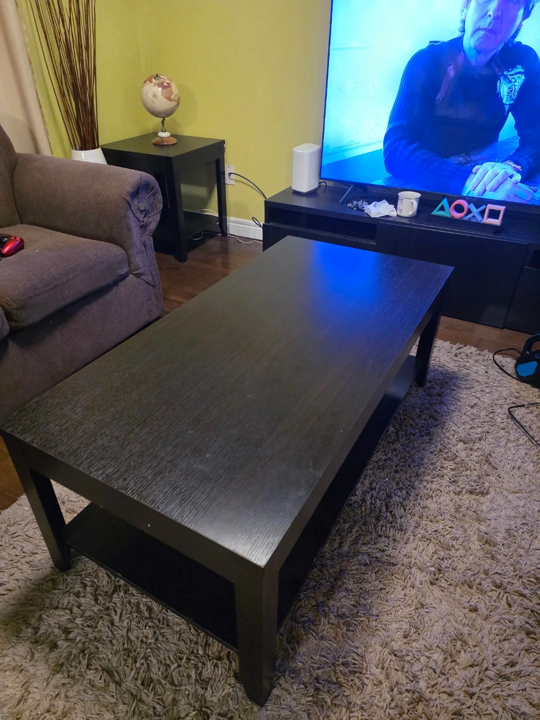 This dark brown coffee table has a sleek, modern design. It features a lower shelf for extra storage. A good size for most living rooms! (Open to offers im moving out of country)