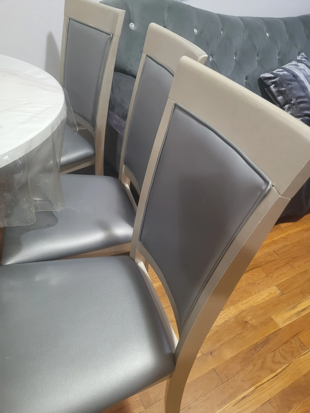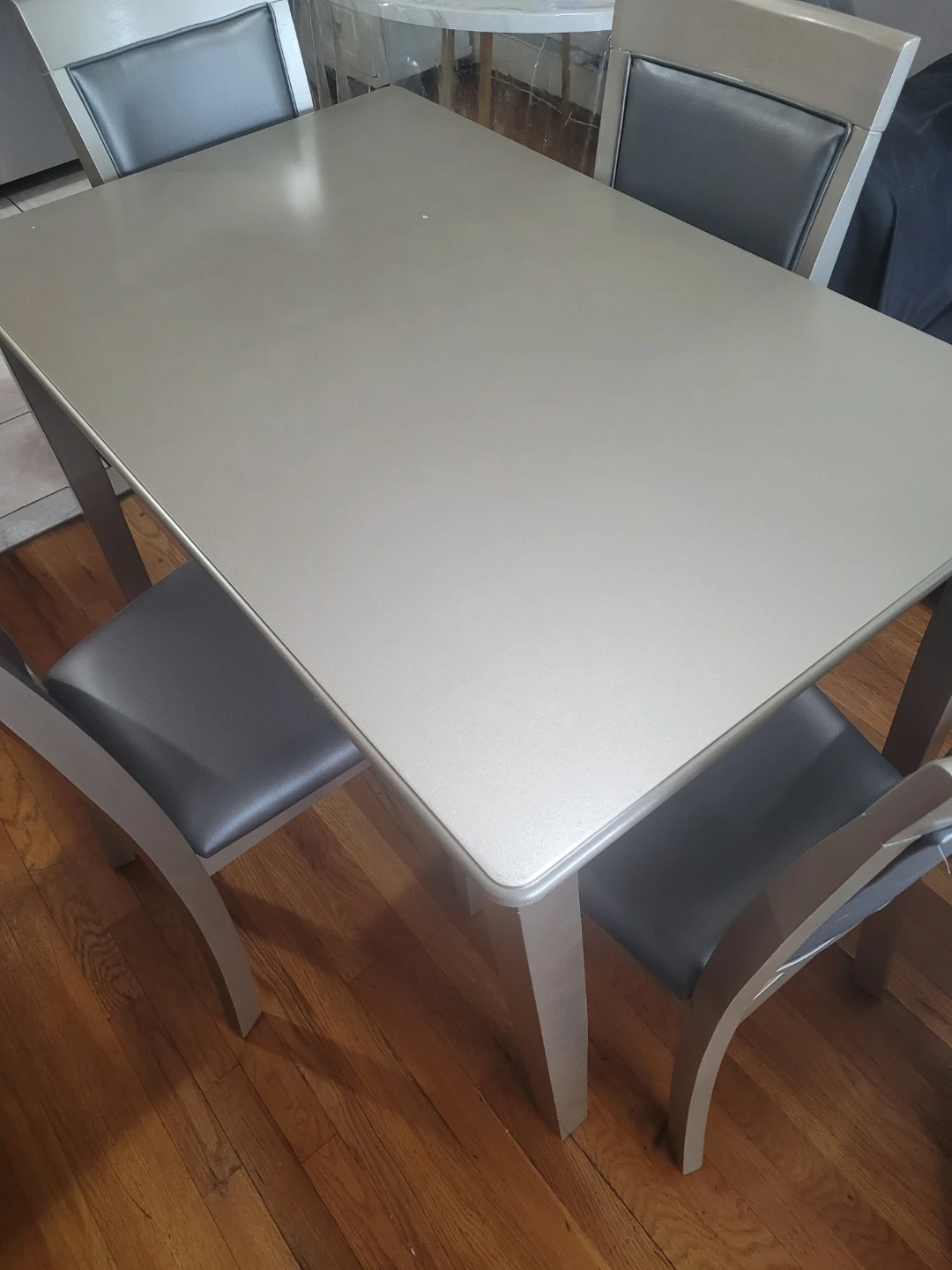 A set of four dining chairs with a matching table. Chairs have gray upholstered seats and backs with a light wood frame. Table has a metallic gray finish. Seats four people comfortably.