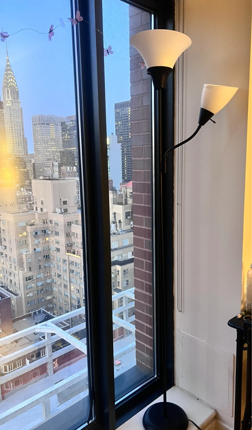 Adjustable floor lamp with a black finish. It has a main light and a smaller reading light on an adjustable arm. The lamp is made of metal and features frosted glass shades.