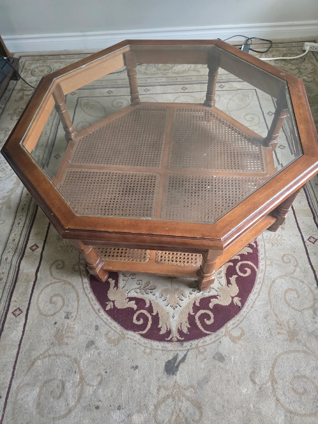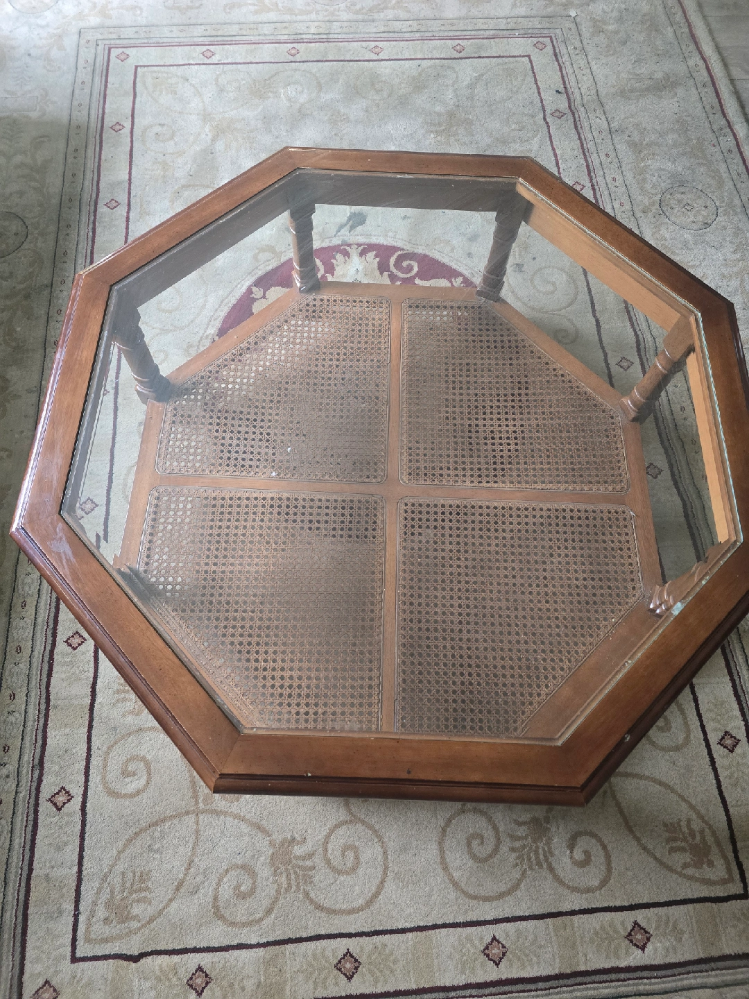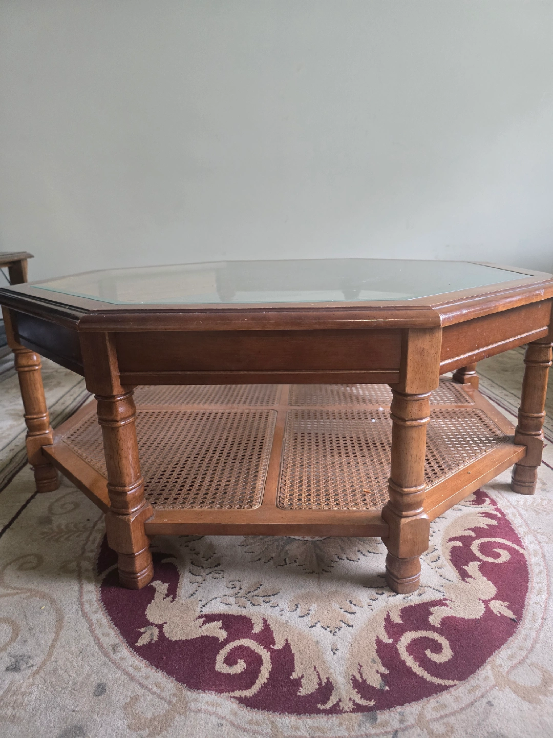 10Selling a unique octagon-shaped coffee table with a glass top and woven cane detailing on the lower shelf. It's a stylish piece that would look great in any living room. The wooden frame has a warm, classic look.
