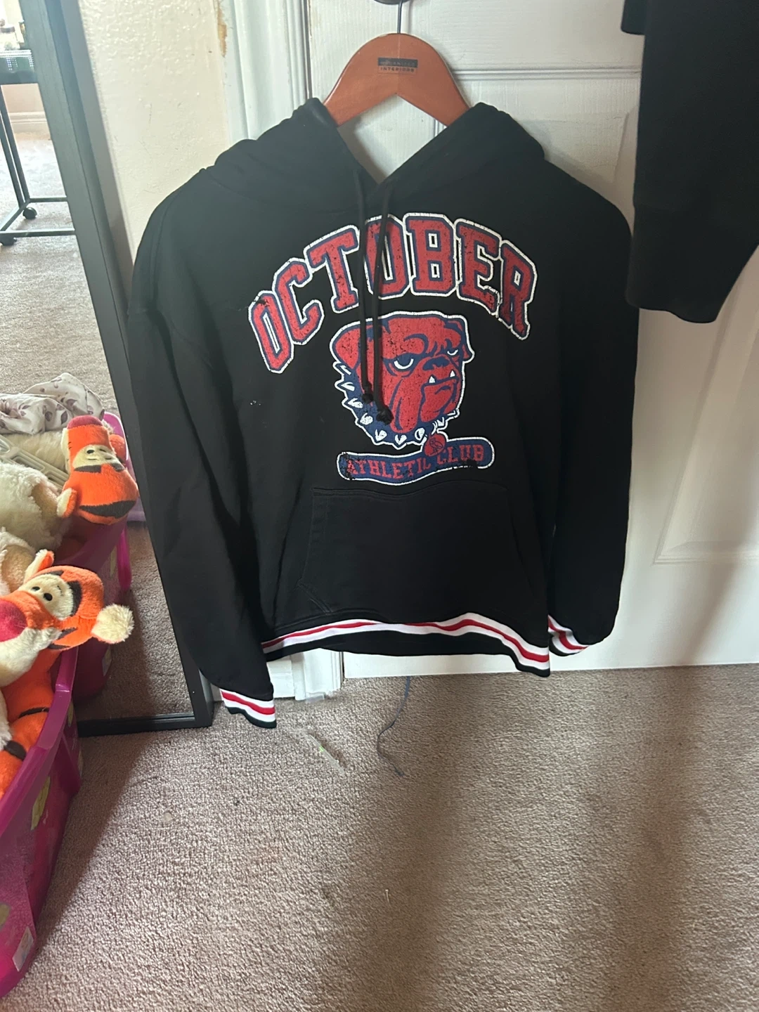 Selling a black October's Very Own (OVO) Athletic Club hoodie! It features a red bulldog graphic and the word 'OCTOBER' in red lettering. The hoodie has a front pocket and red and white striped detailing on the cuffs and hem. Great for staying cozy and showing off your style