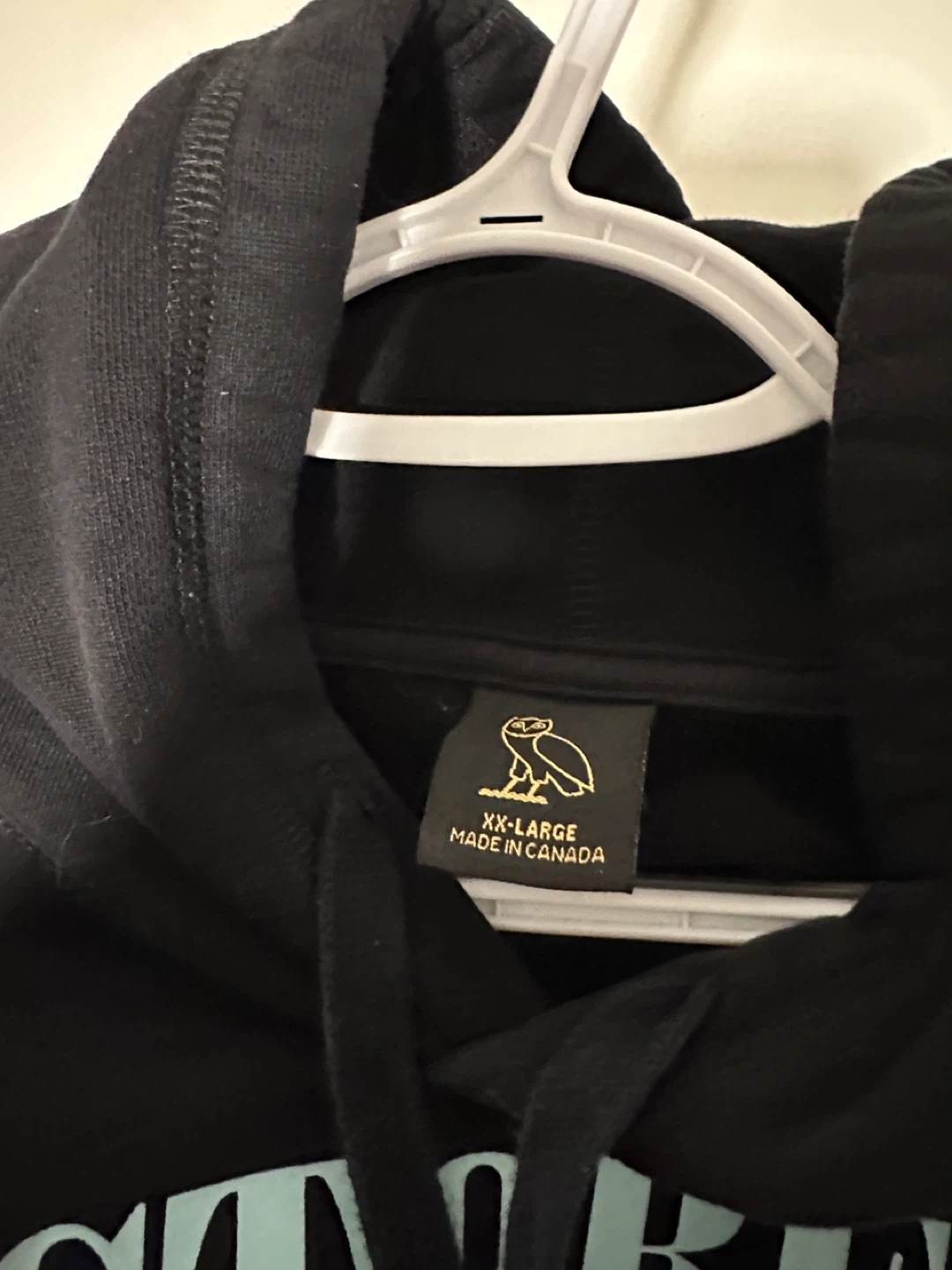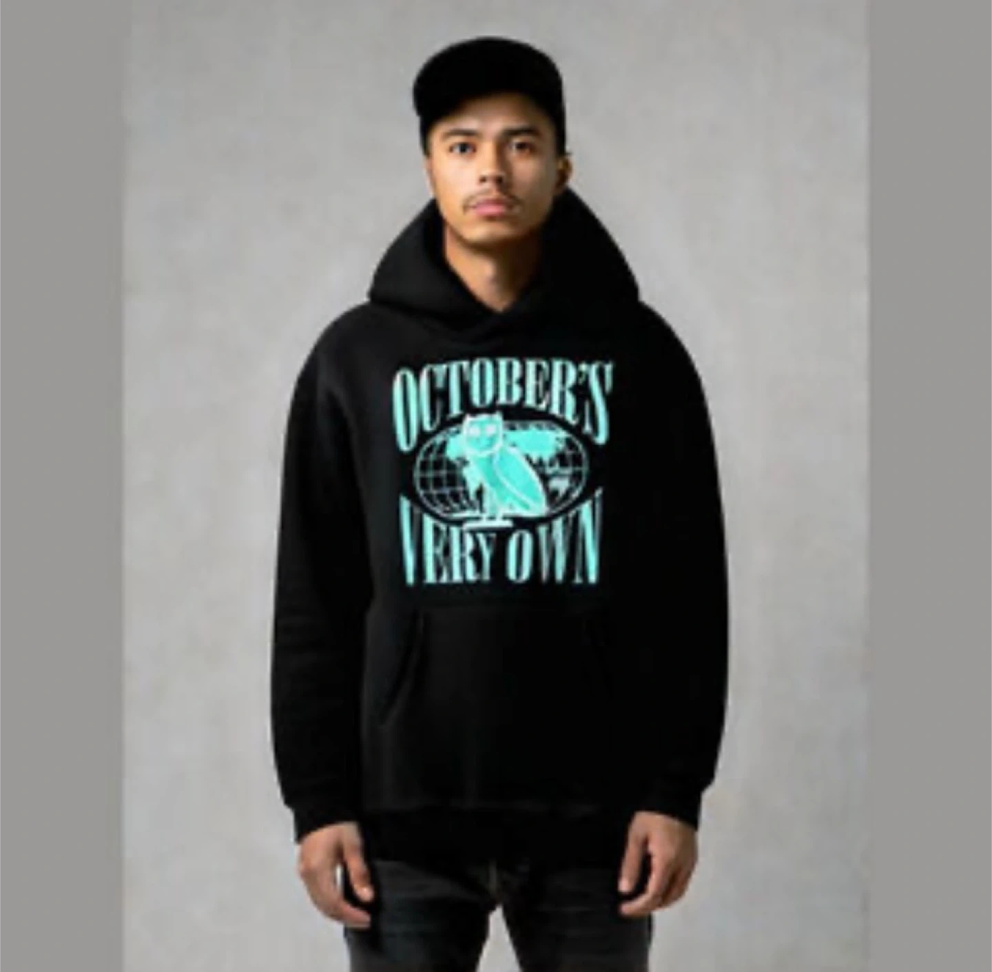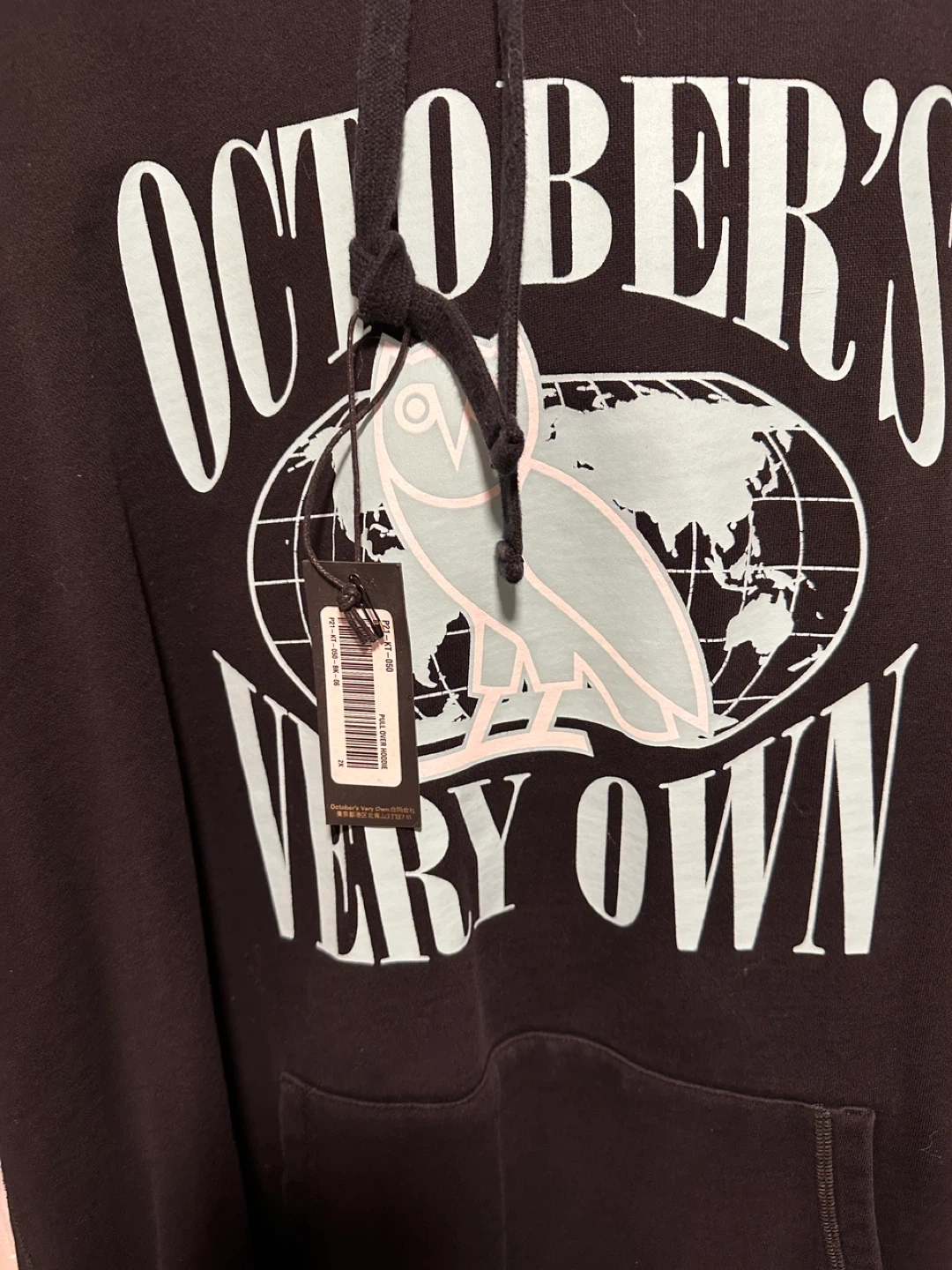 299Selling a black hoodie from October's Very Own (OVO). The hoodie features the iconic OVO owl logo with a globe design. It's in great condition and ready for a new home!