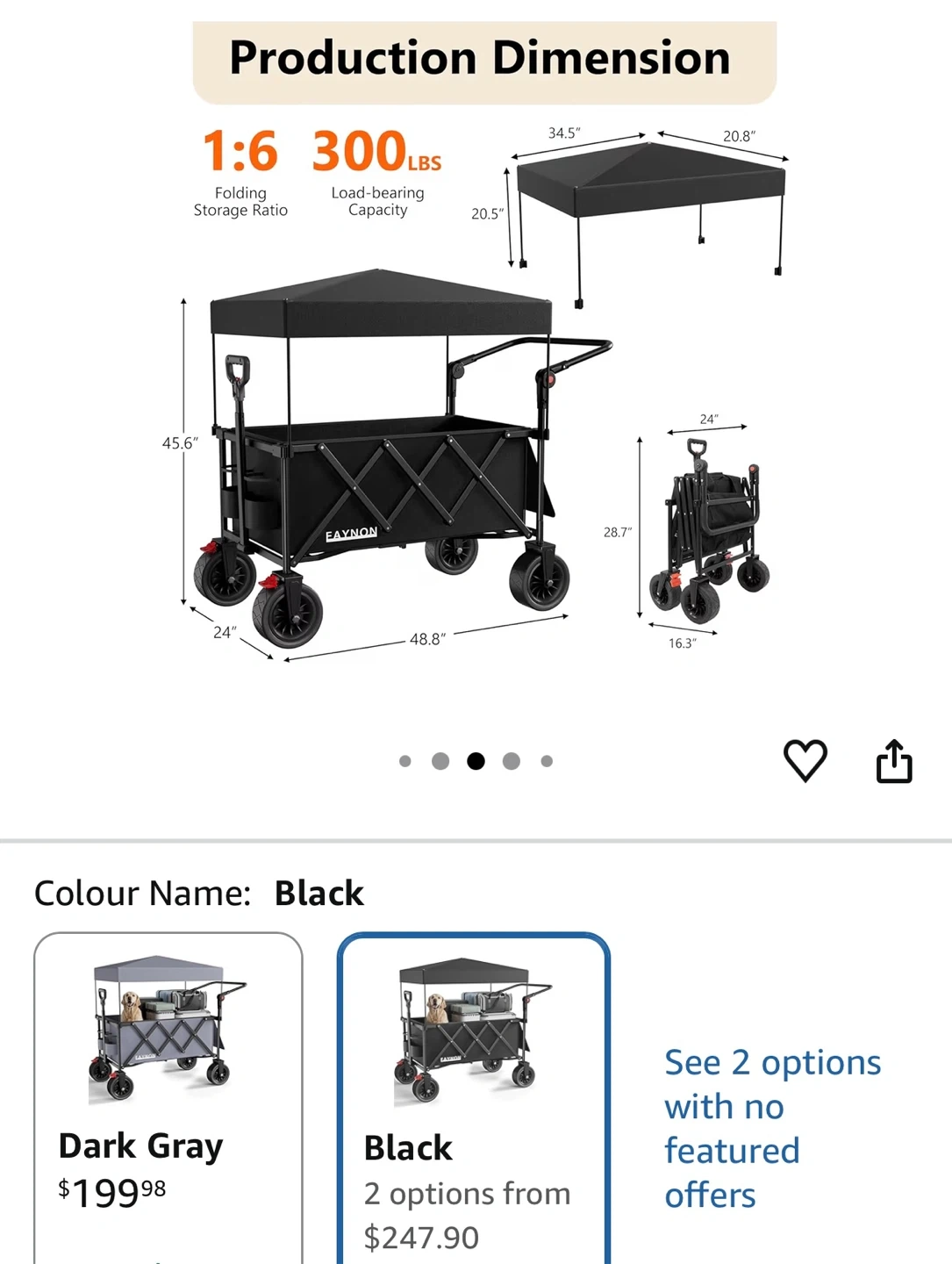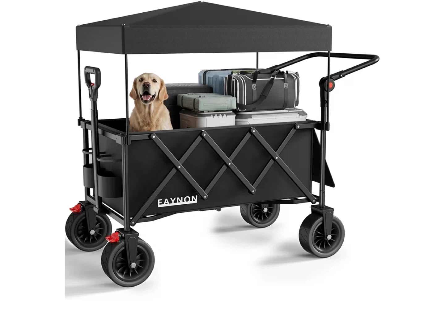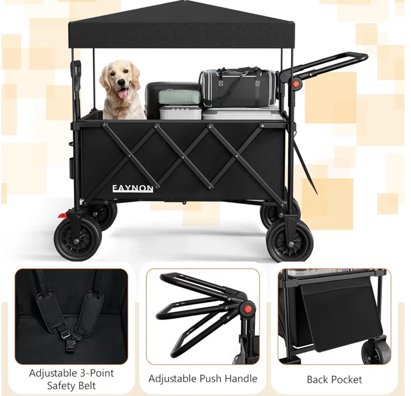 This black Faynon wagon offers a large hauling capacity with a folding design for easy storage. It features an adjustable push handle and a back pocket for convenience. The canopy provides shade for pets or gear.