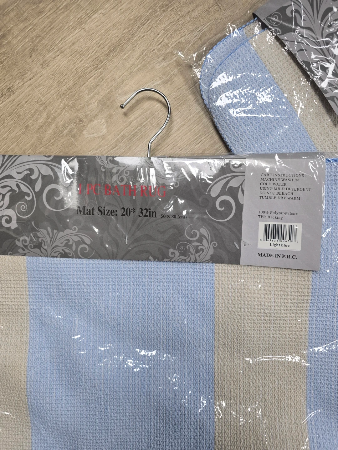 This is a two-piece bath rug set in light blue with brown stripes. The bath mat is 24"x40" and the contour mat is 24"x20". Second Rug set 24"×20" . Both mats are 100% polypropylene with a TPR backing. They're machine washable in cold water using mild detergent.