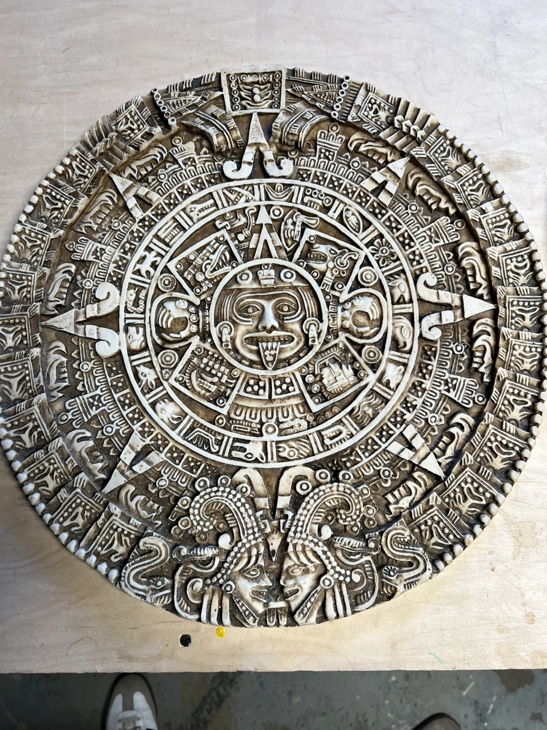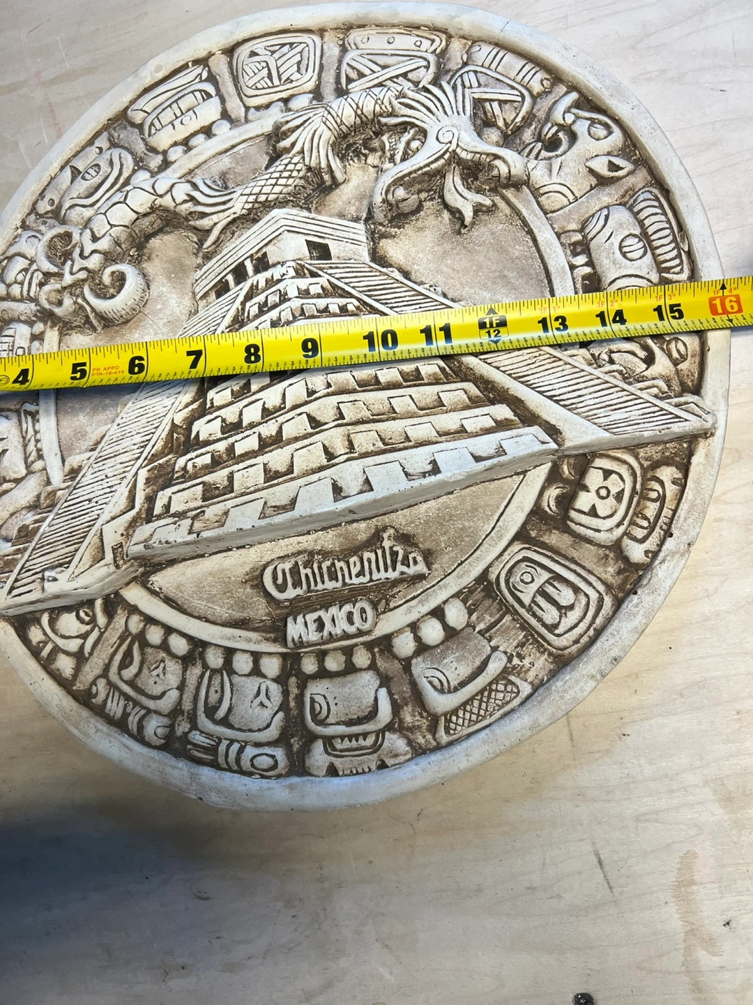 This decorative wall piece features a detailed replica of the Mayan calendar, with 'Chichen Itza Mexico' visible. It measures approximately 15 inches in diameter. It's made of a durable material and includes a hook on the back for hanging. Perfect for adding a touch of history and culture to your space! 25 dollars each
