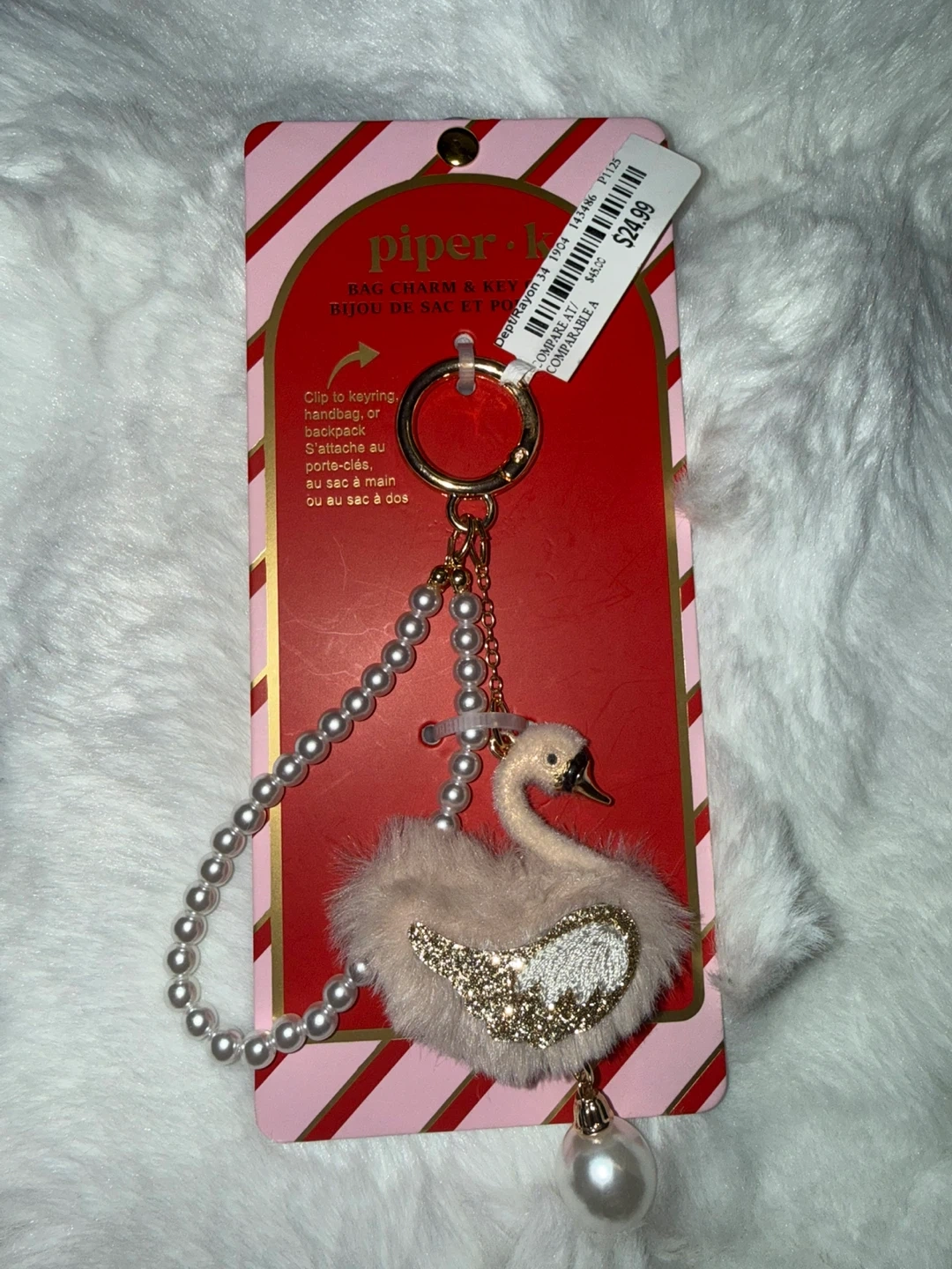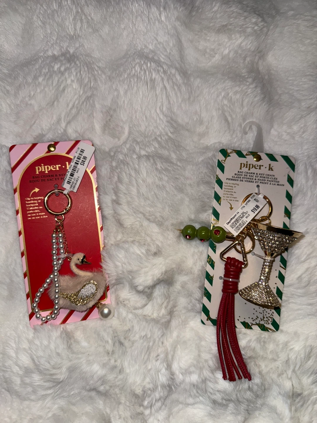 Two adorable bag charms and key chains from Piper-k. Features a sparkly martini glass with a red tassel and a fuzzy swan with pearls. Clip to keyrings, handbags, or backpacks!