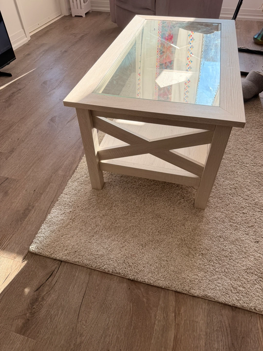 This coffee table has a light wood finish and a clear glass top. It features a lower shelf for extra storage. Its clean design makes it a versatile addition to any living space.