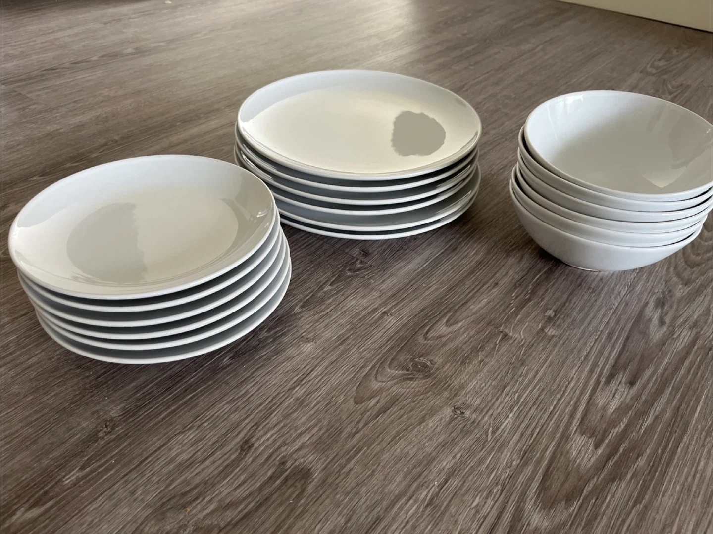 This is a set of 12 white ceramic plates and bowls. The set includes six dinner plates and six soup bowls. They're a nice addition for everyday use or entertaining guests!
