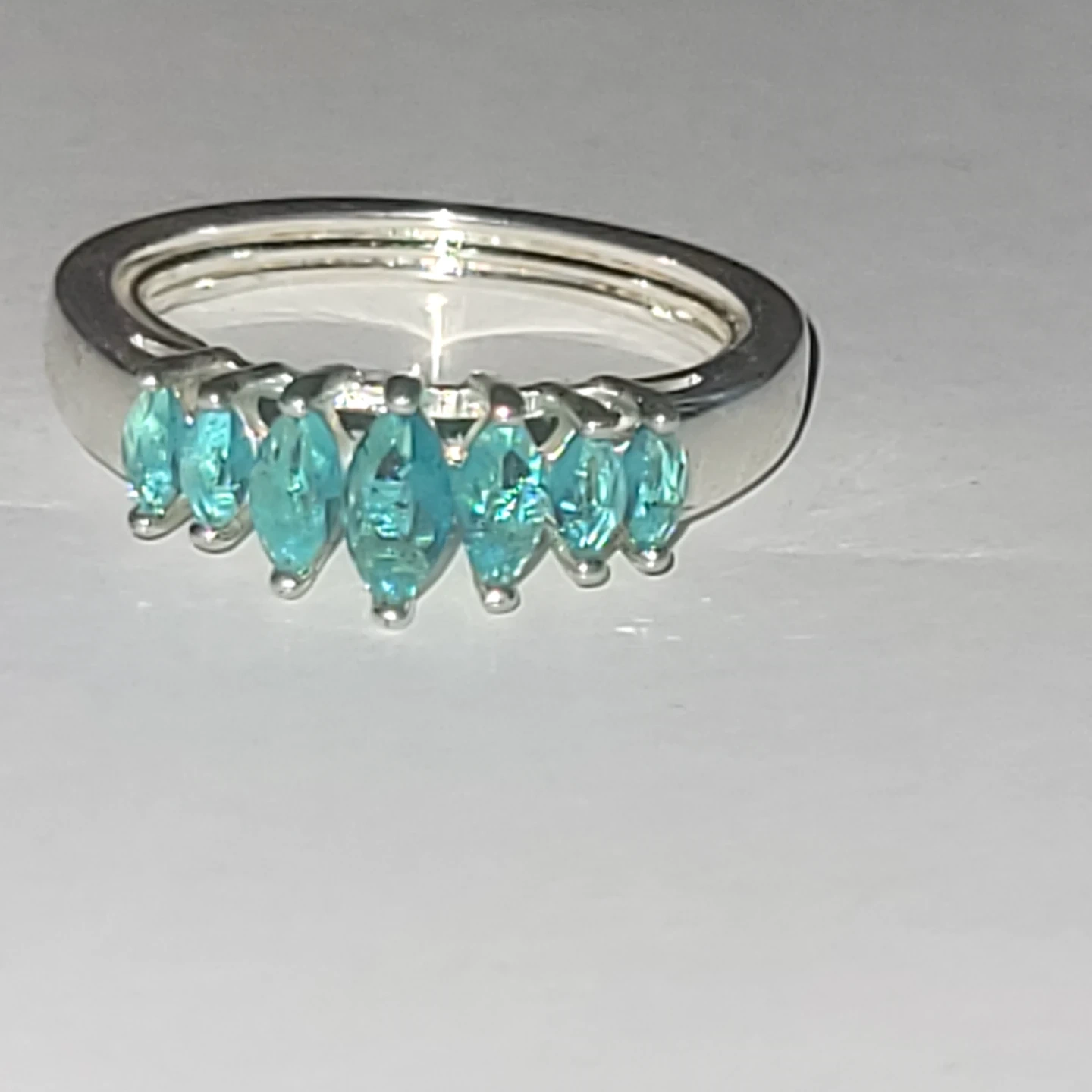Sterling silver band ring featuring a line of six blue marquise-cut stones. It's a beautiful piece for everyday wear or special occasions.