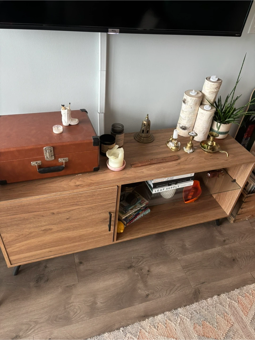 This modern media console features a warm wood finish and a convenient glass shelf. It's perfect for organizing your entertainment essentials. Measures 47 inches wide, 26 inches tall, and 15.5 inches deep.