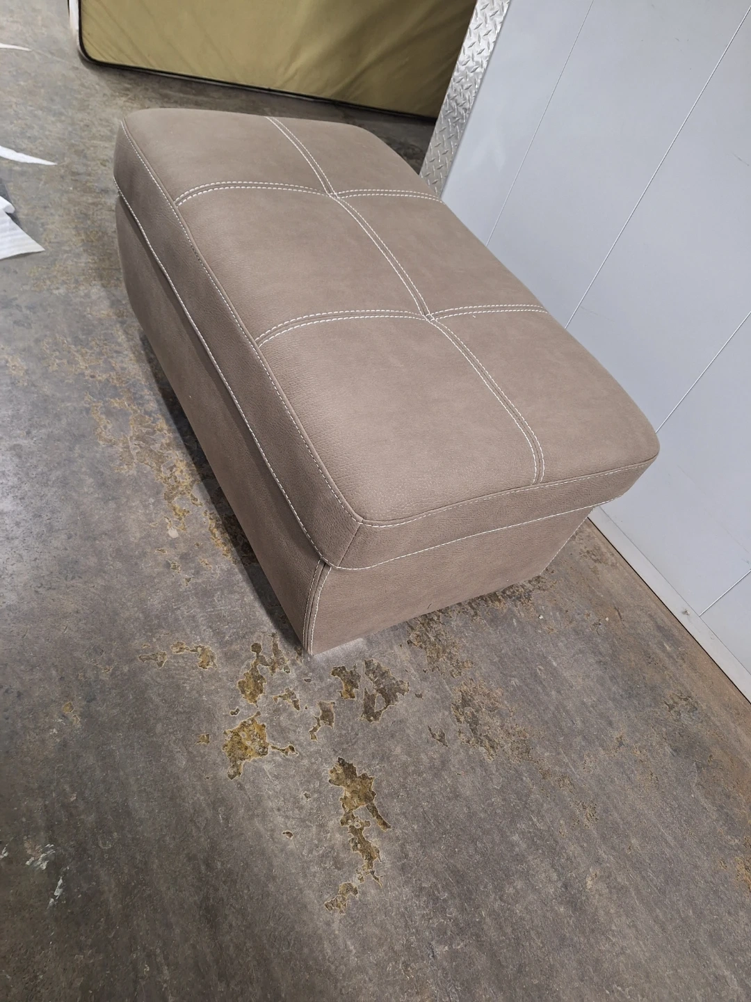 This taupe storage ottoman bench offers a great place to sit or rest your feet. It's upholstered in a soft fabric with decorative stitching. The lid opens to reveal ample storage space inside for blankets, pillows, or other items. It's a practical addition to any living room or bedroom!