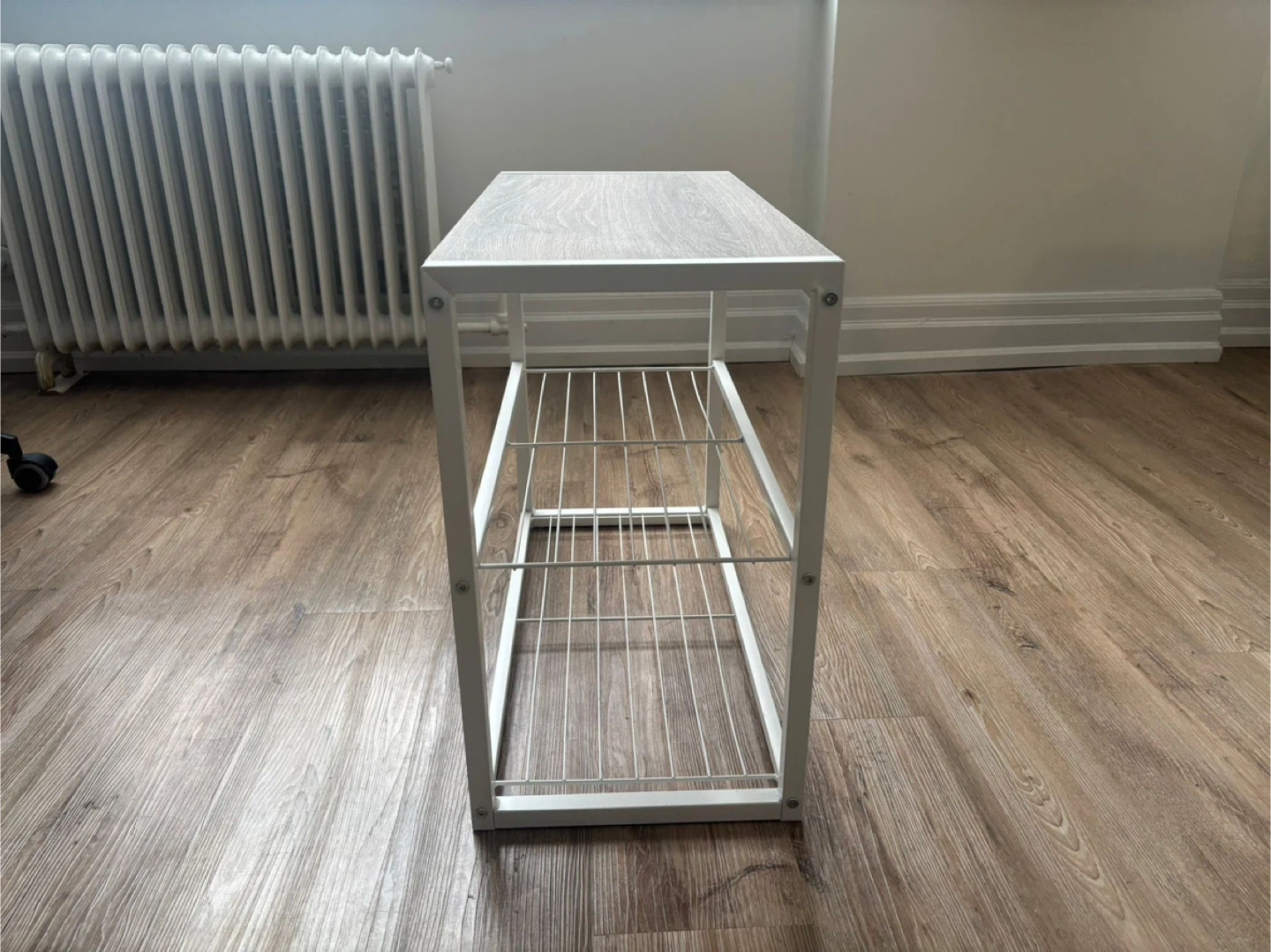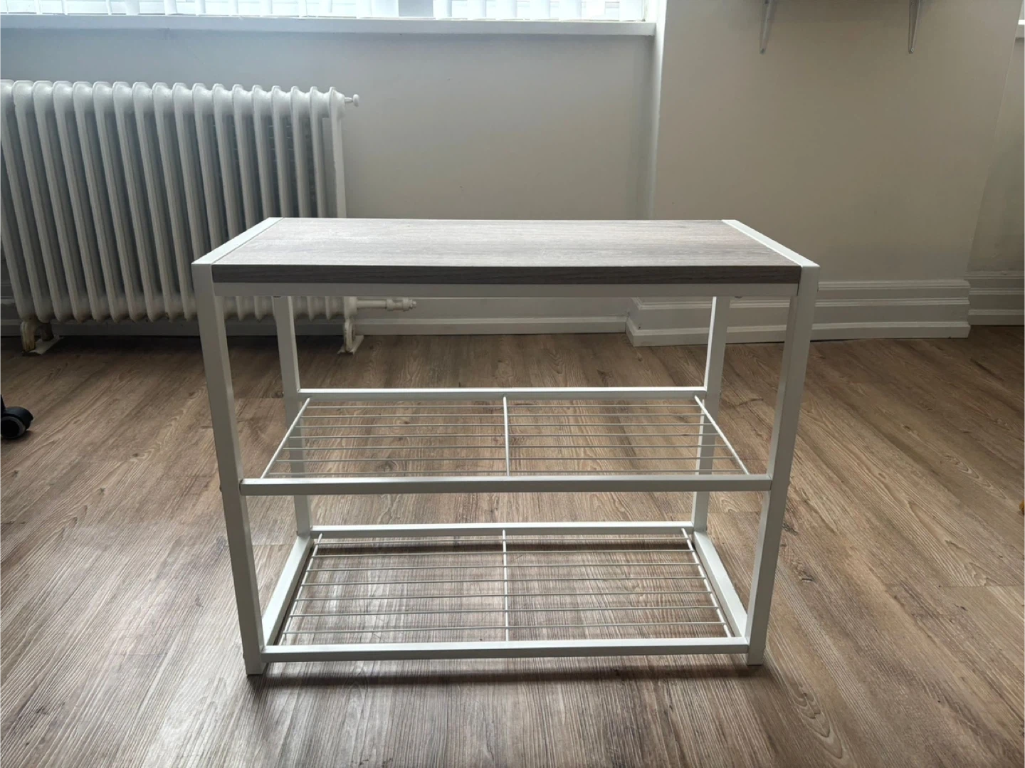 This is a 2-tier wire rack shelf unit. It features a faux wood top surface and a white metal frame. The shelves are made of wire mesh. It's great for entryways or kitchens!