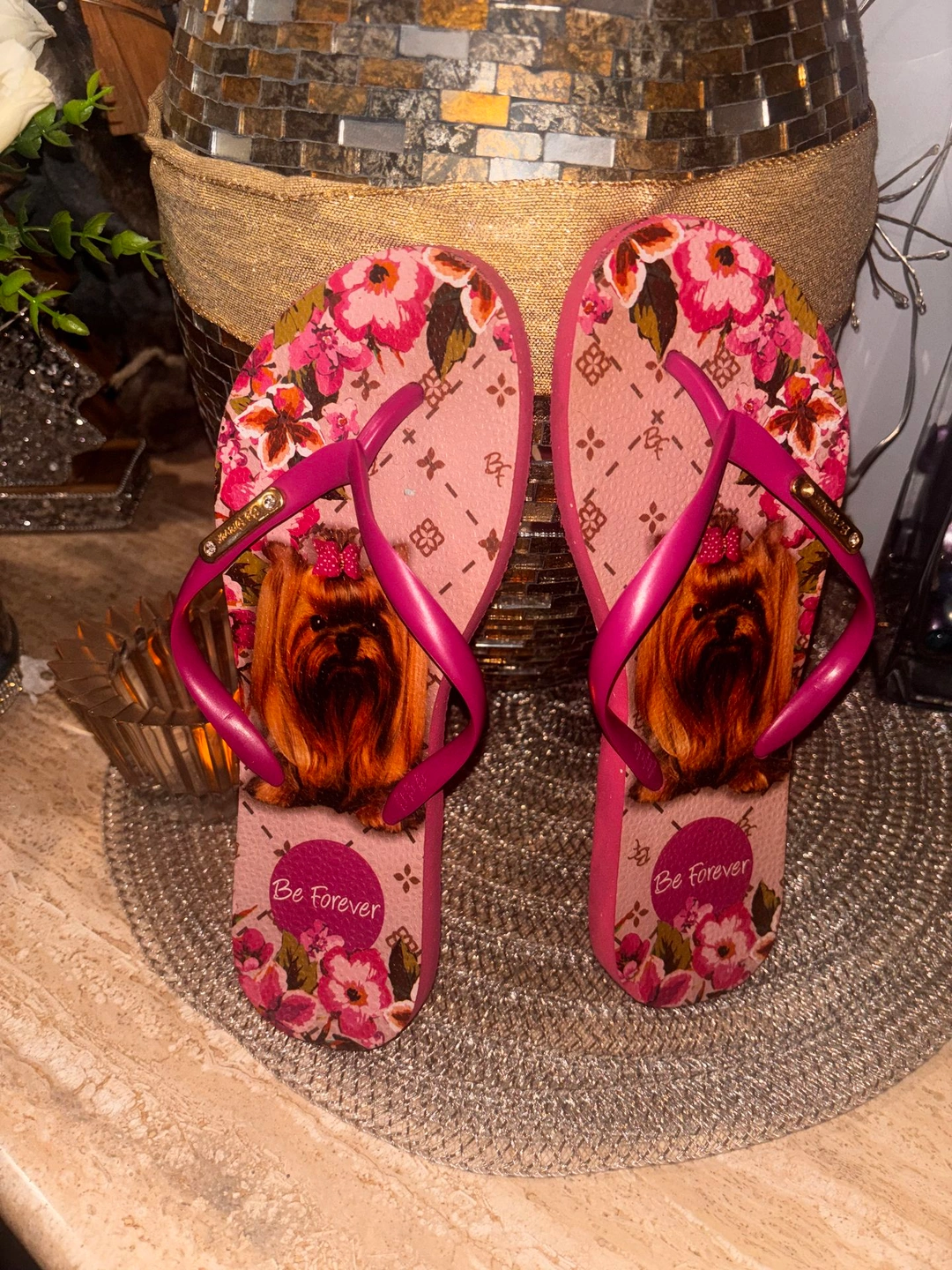 Adorable Be Forever flip-flops featuring a floral design with a cute dog illustration. Lightweight and comfortable with flexible straps. Perfect for vacations, beach days, poolside lounging, or casual summer wear. Size: Fits Women’s 6.5–7. Gently used, excellent shape.