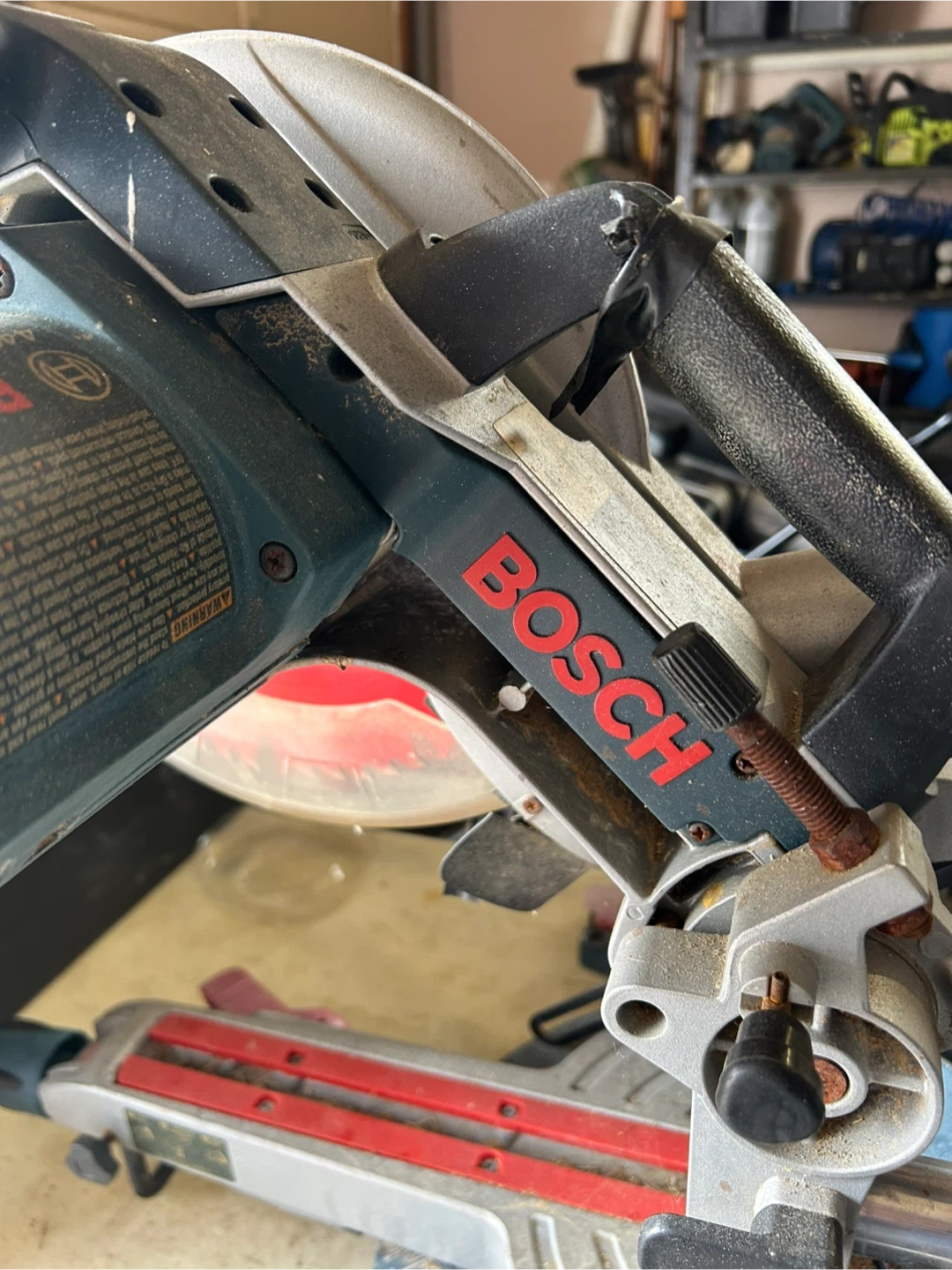 Bosch 4405 10" (254mm) slide miter saw. It's powered by a 120V, 60Hz, 15A motor with 4780 RPM. Includes an original box.