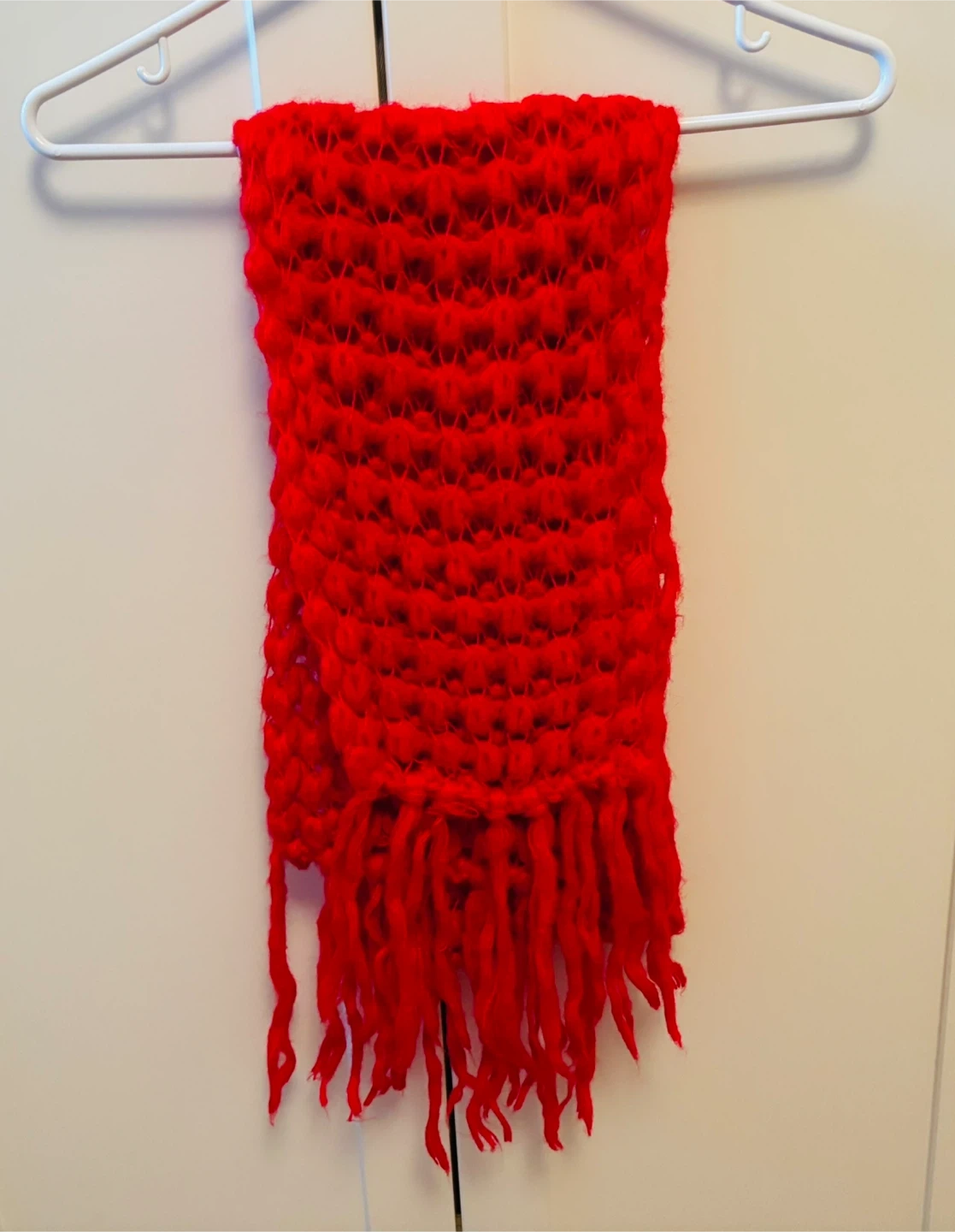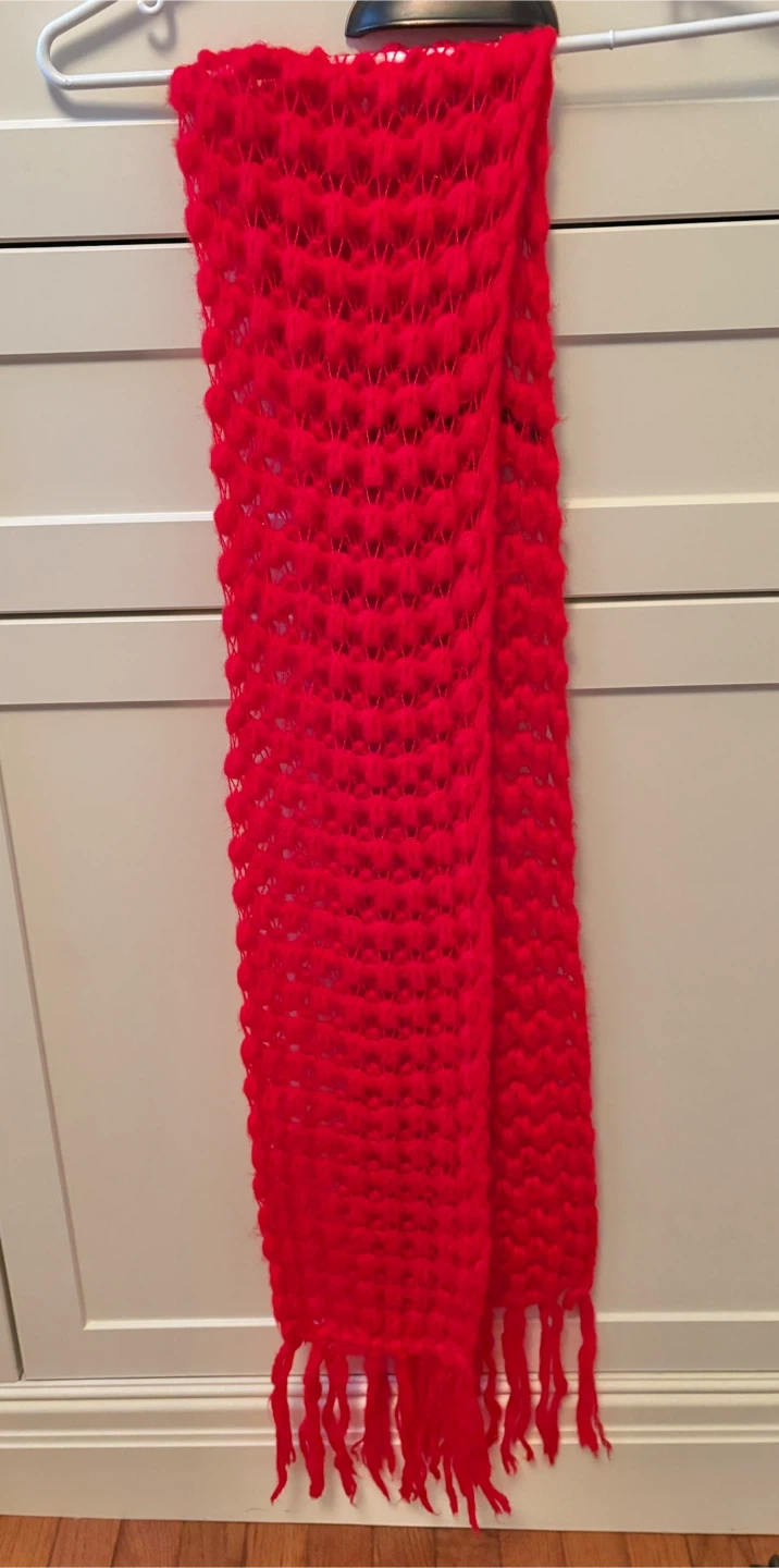 A cozy red knitted scarf. It features a unique textured pattern and is finished with playful fringes. This scarf would be nice for adding a pop of colour to your winter outfit!