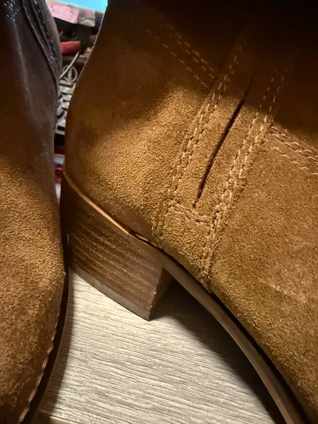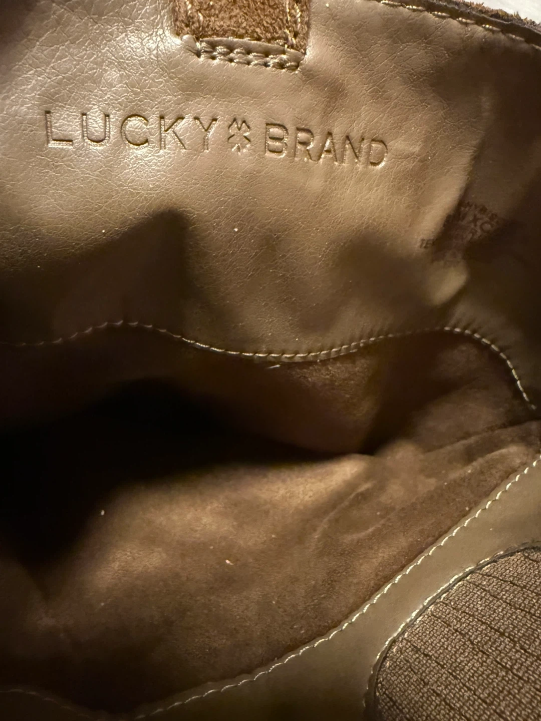 These are Lucky Brand brown suede knee-high boots. Leather upper with a textile/man-made lining and sole. Size 8.5 M (US), 39.5 (EU).