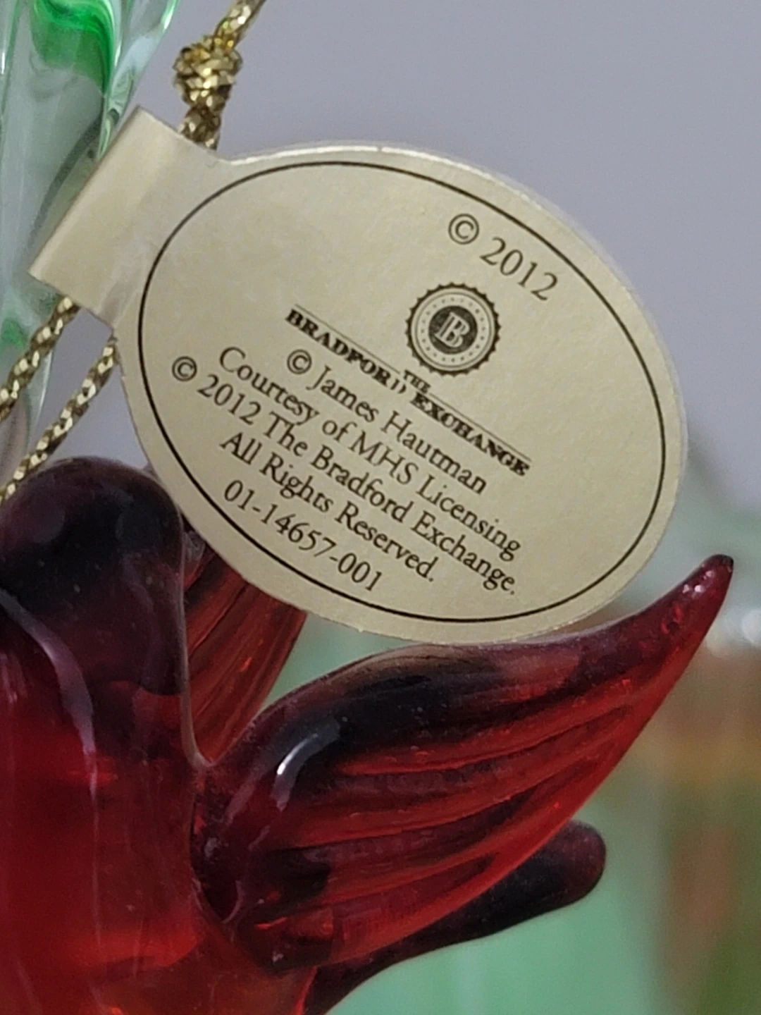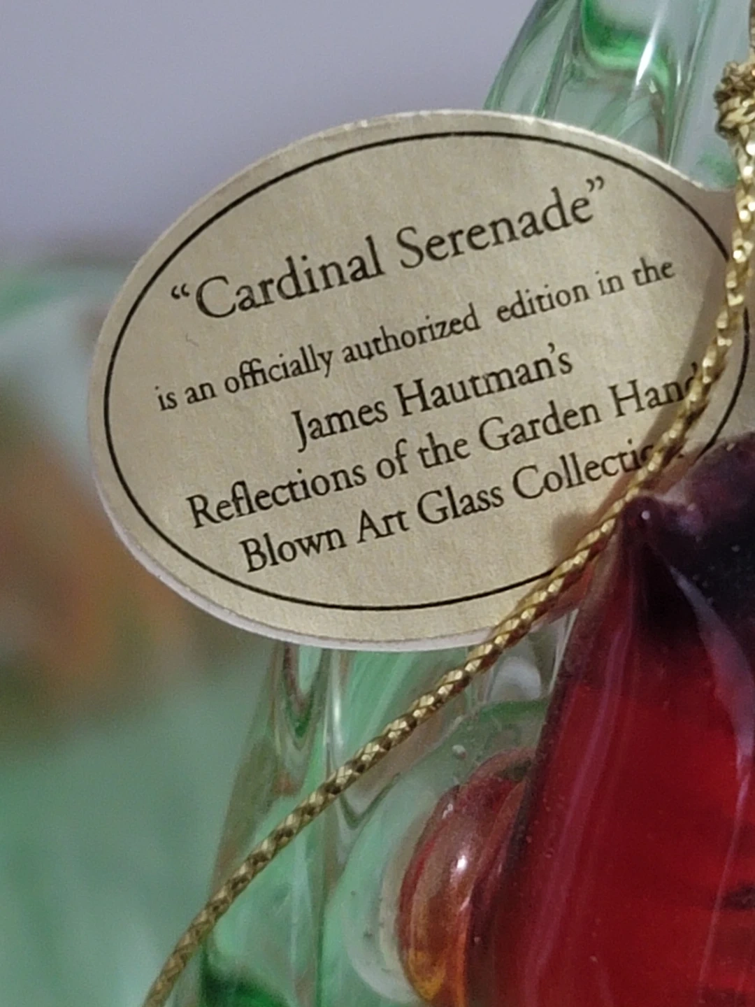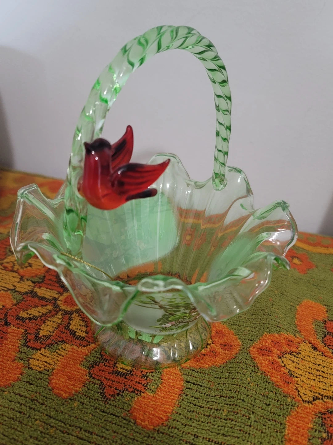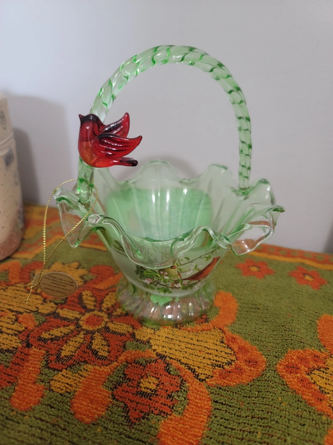 This is an officially authorized limited edition glass basket. It's part of the James Hautman Reflections of the Garden Hand Blown Art Glass Collection. Features a delicate green basket with a red cardinal accent. Bradford Exchange item from 2012.