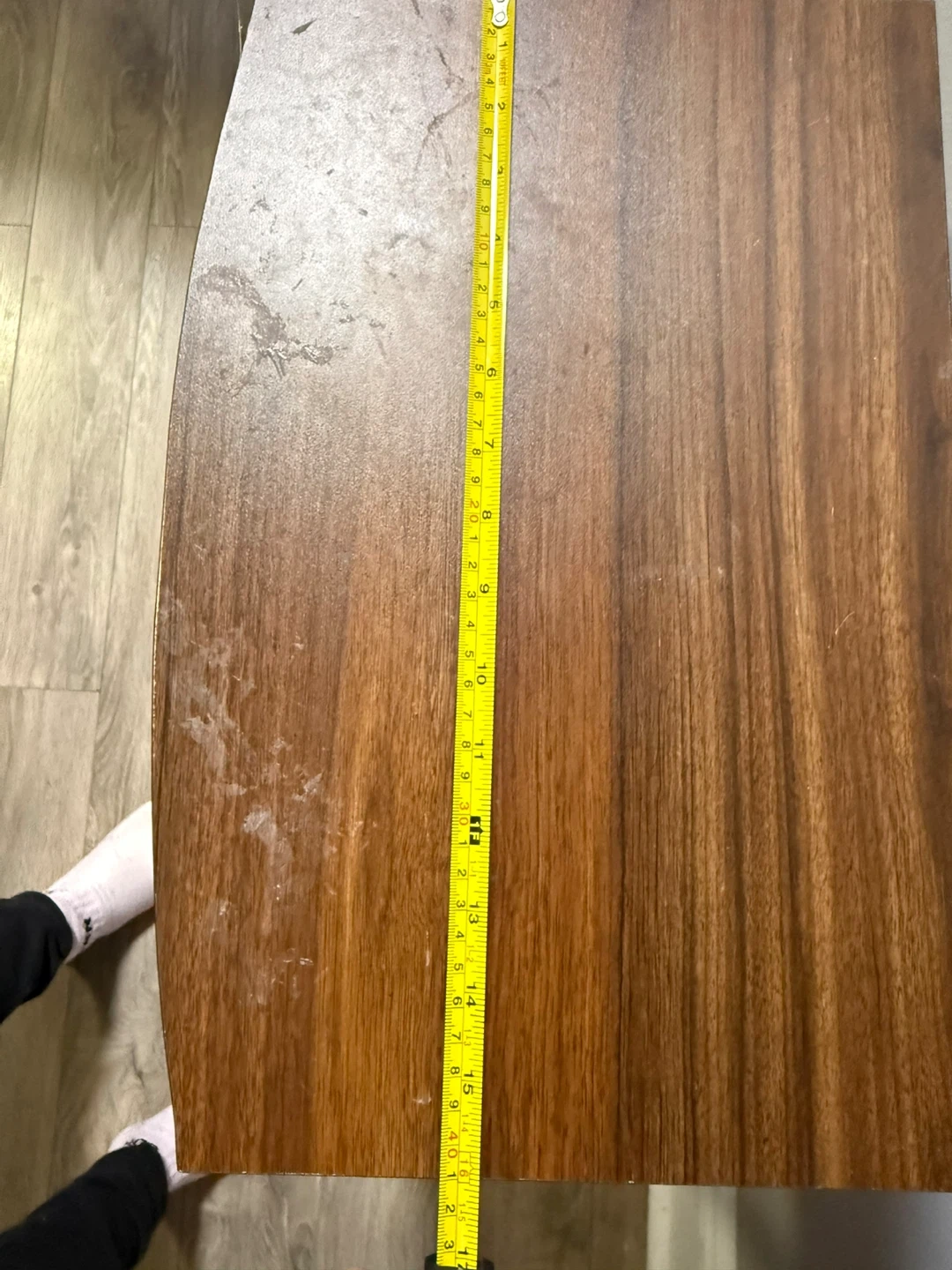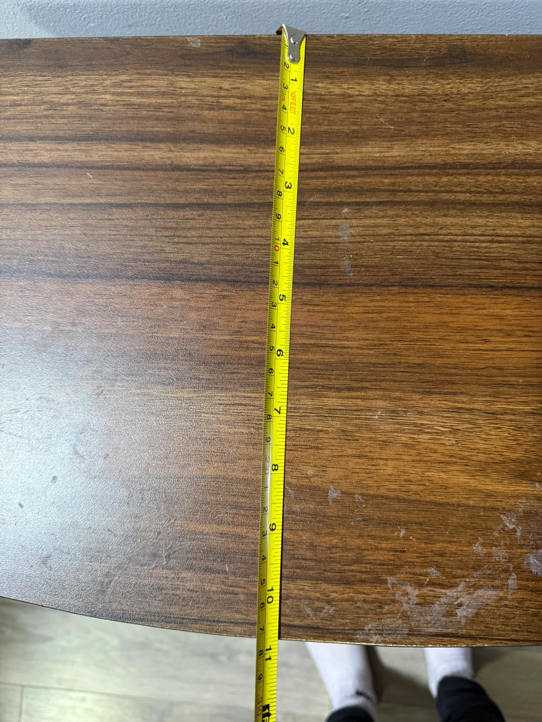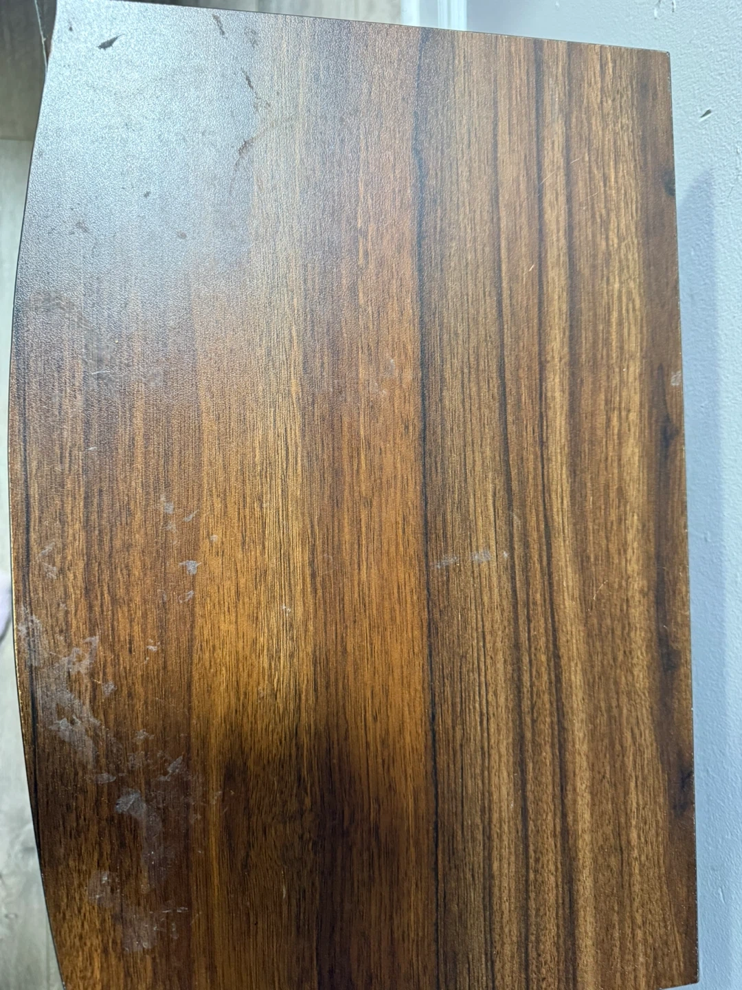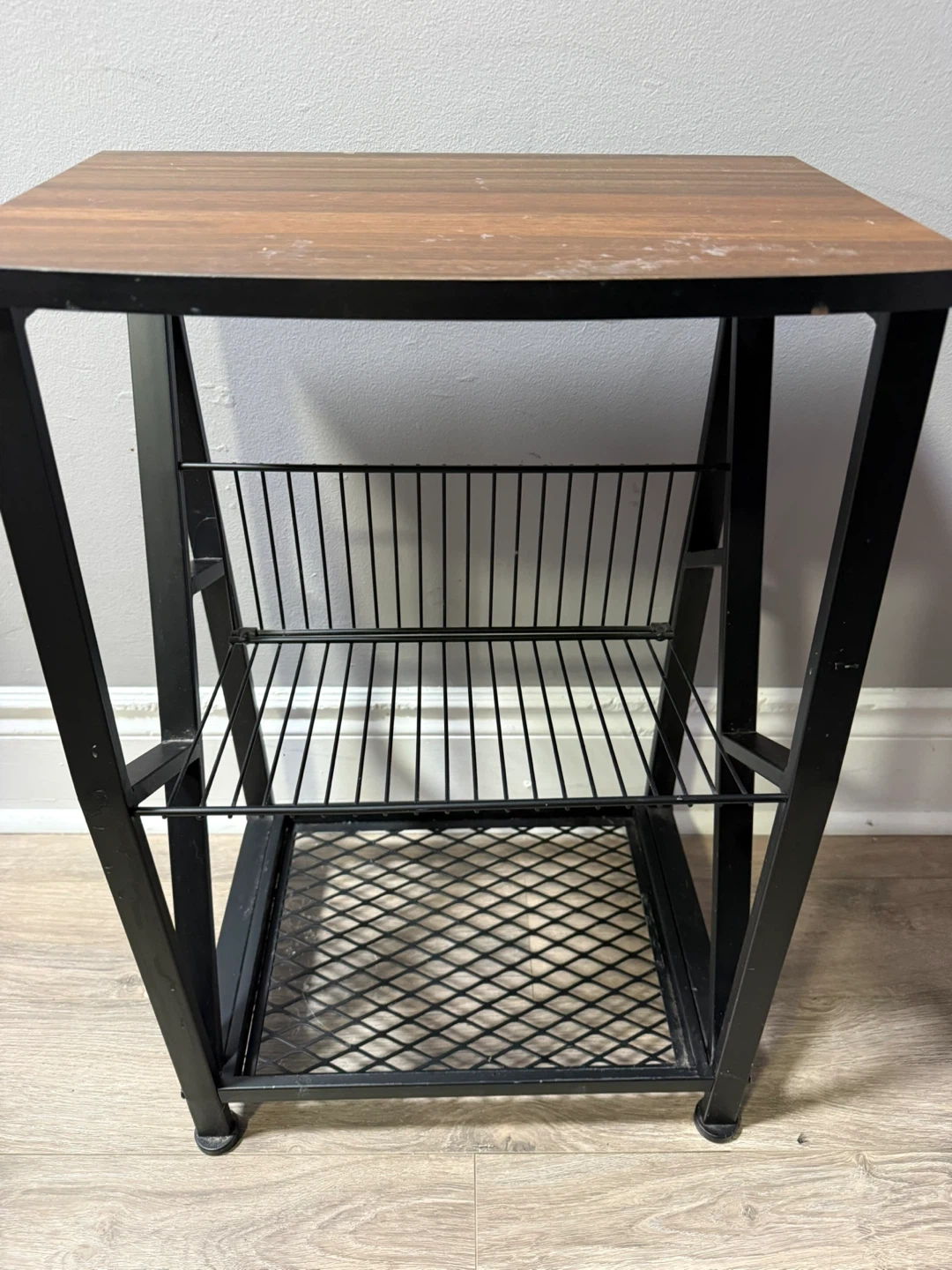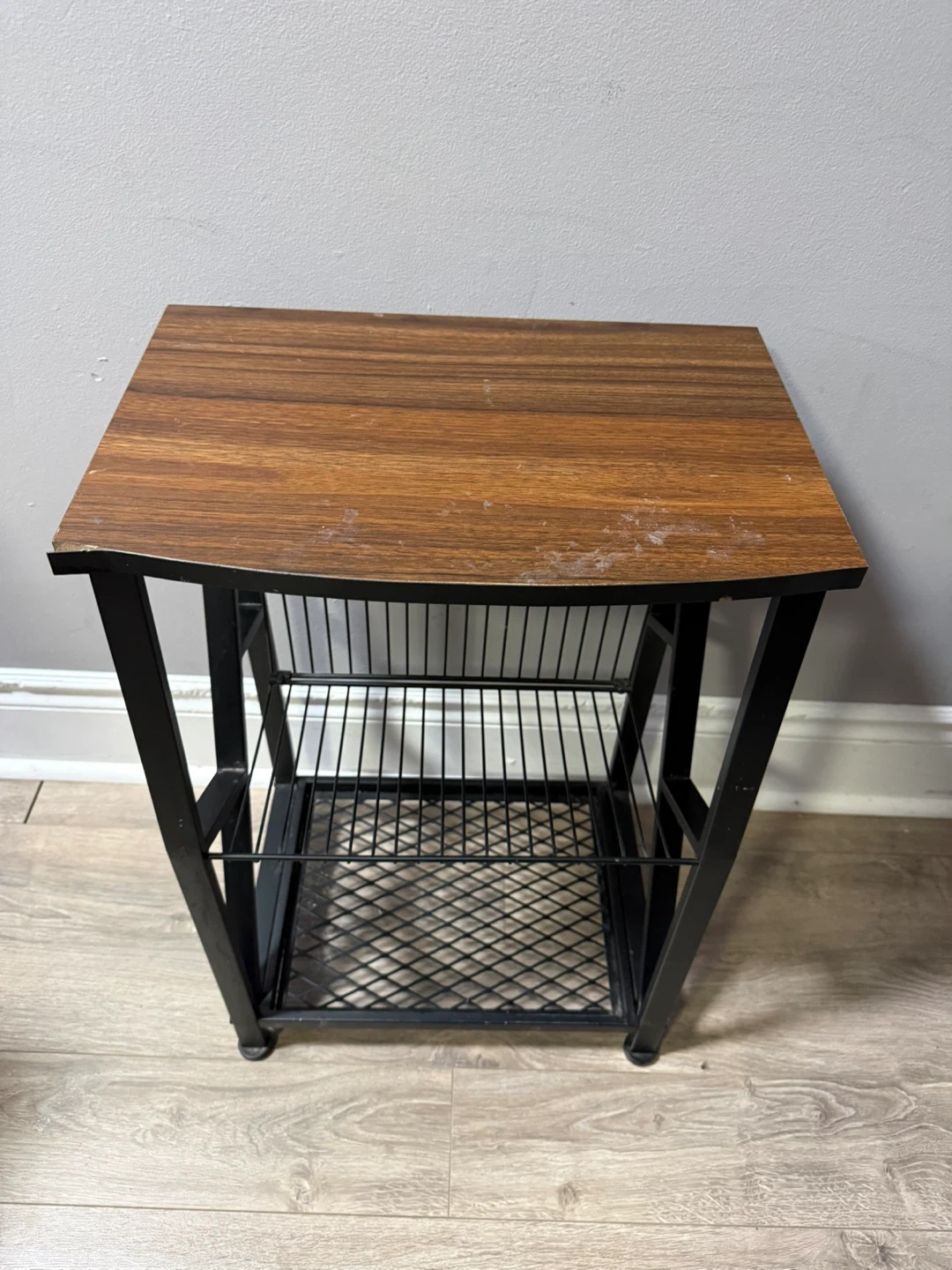 This side table features a wood-look top and two metal wire shelves for storage. Whatever is on the top won’t come off unfortunately.