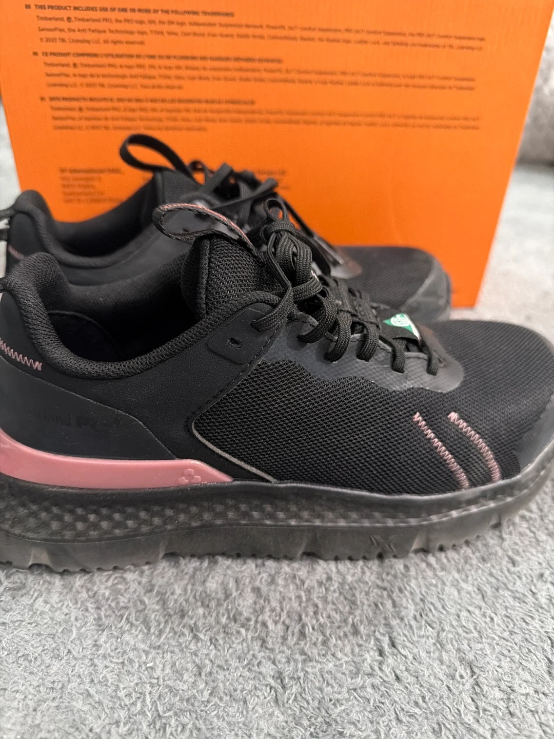 Timberland PRO women's black safety shoes with pink accents. These shoes meet ASTM F2413-18 standards for electrical hazard protection. Comes with original box.
