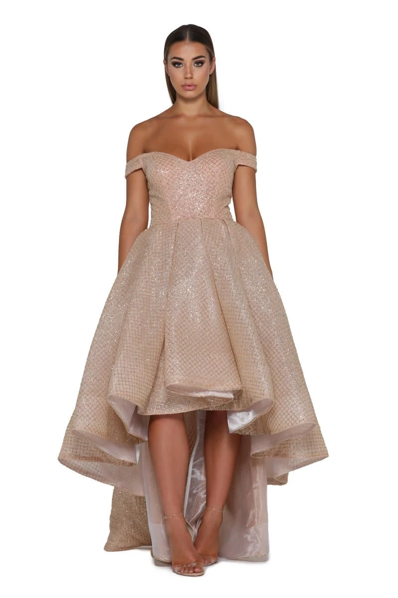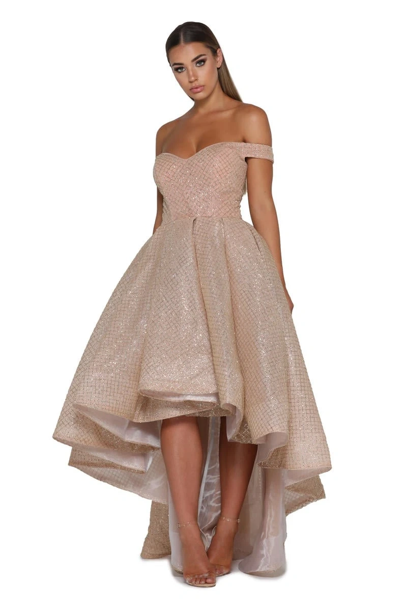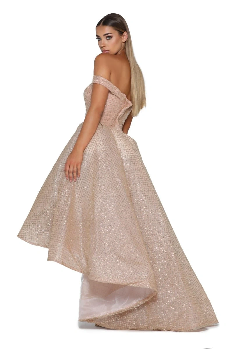 Stunning off-the-shoulder high-low dress. Sparkly gold glitter fabric. Perfect for prom or special occasion. Features a fitted bodice and a full, flowing skirt.