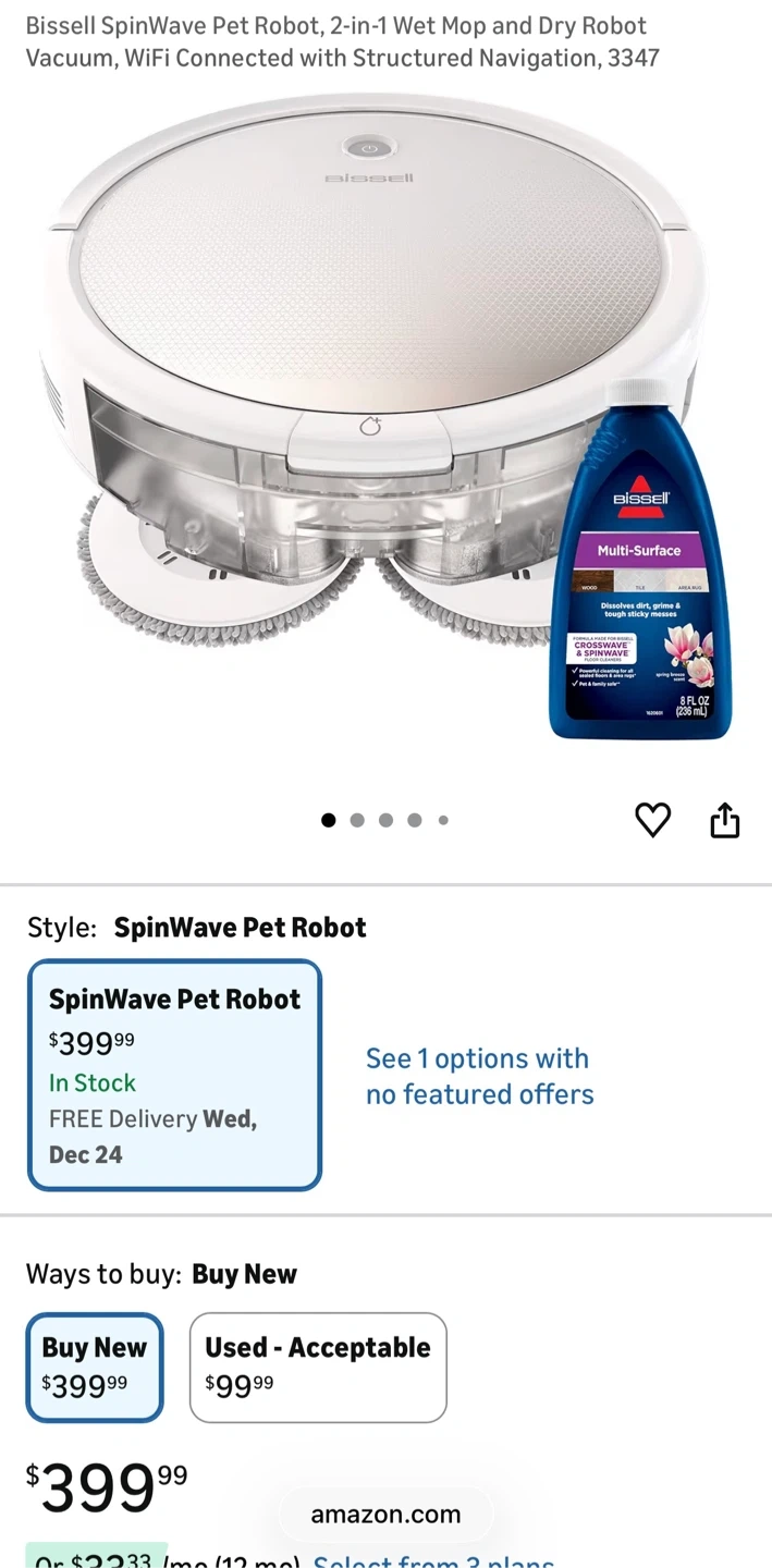 I'm selling a brand new Bissell SpinWave Pet Robot, model 3347! It's a 2-in-1 robotic mop and vacuum designed especially for pet owners. It comes in its original box. This robot is perfect for both wet and dry cleaning, and it even has structured navigation to help it move around your home efficiently. Retails for $399.99!