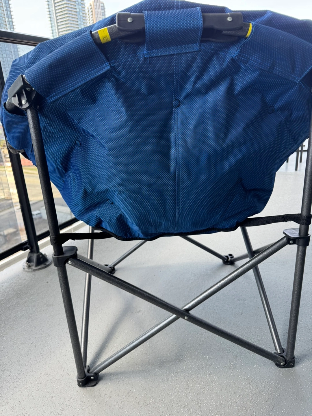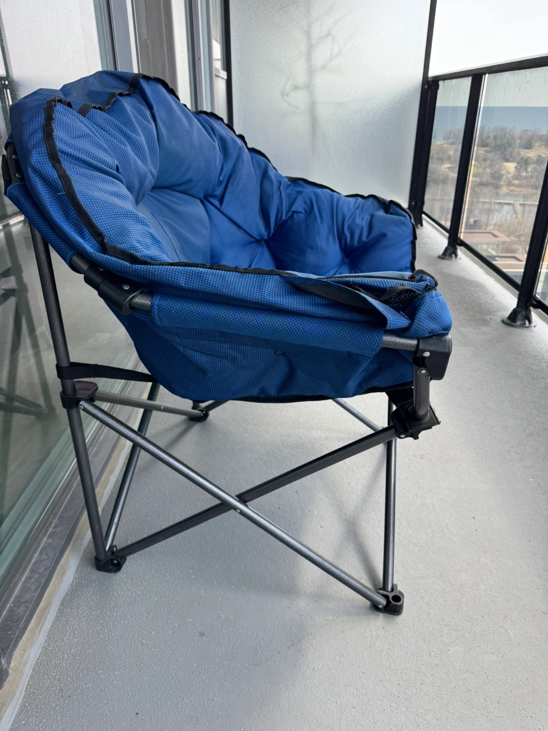 Portable folding chair. Durable metal frame. Blue fabric seat and back. Great for camping, outdoor events, or relaxing on the balcony.