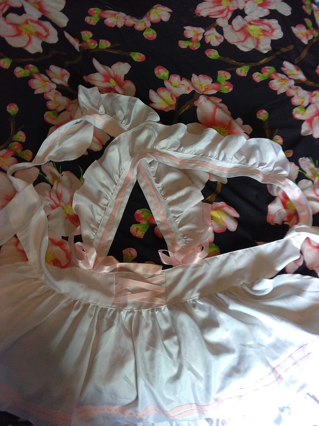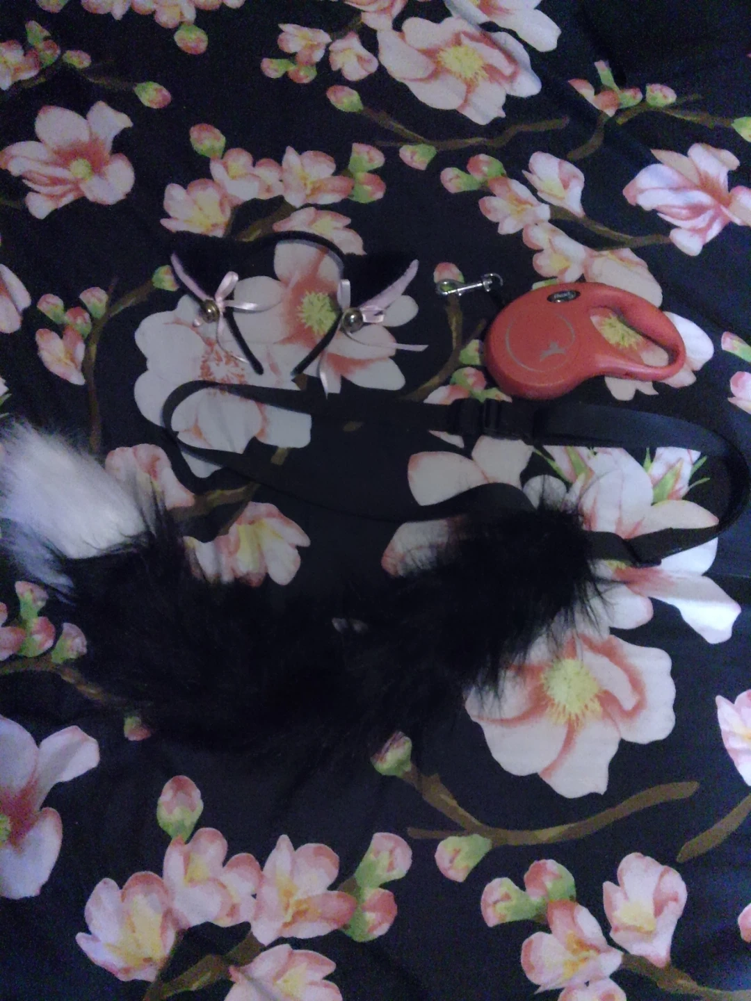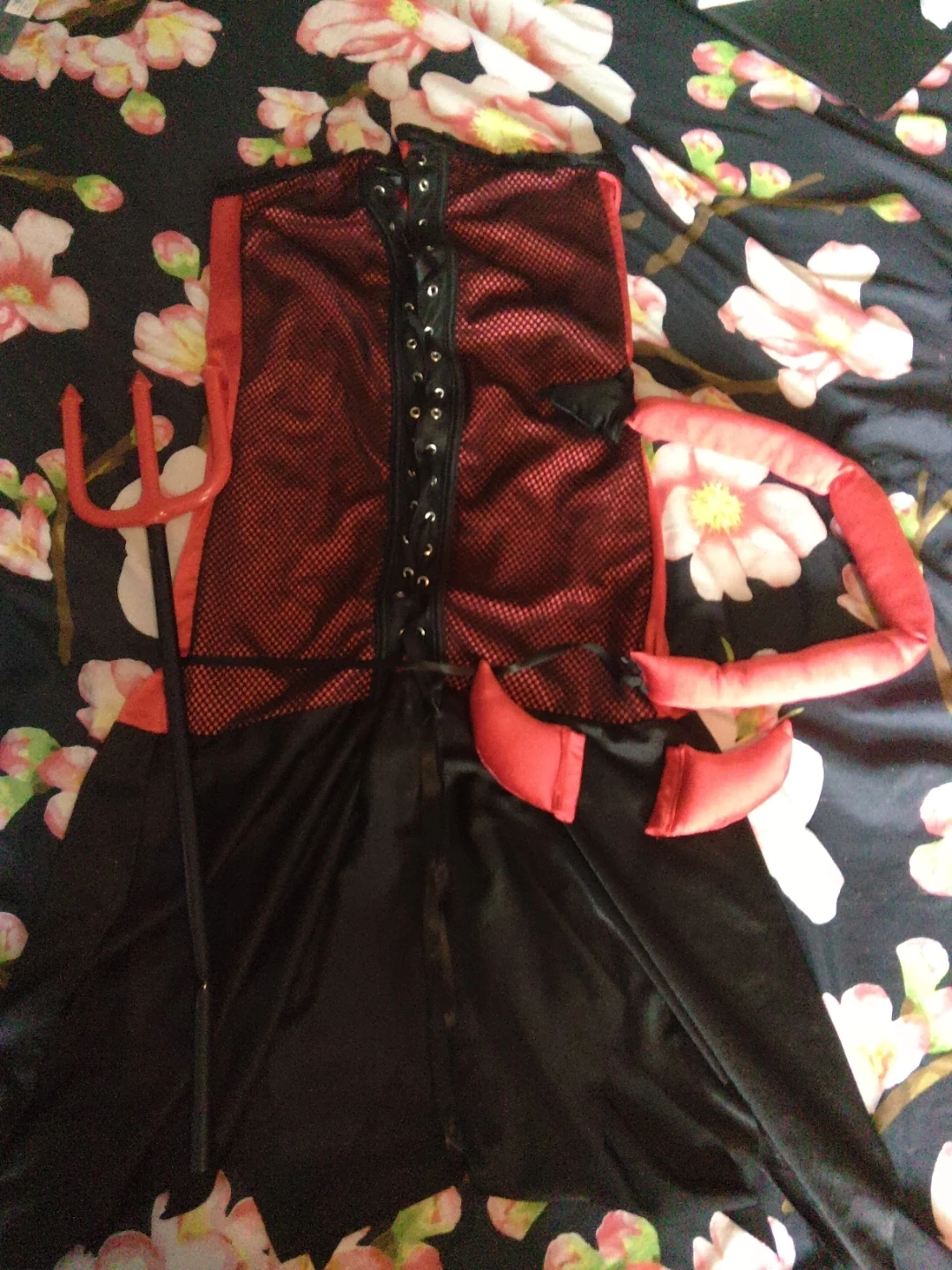 This set includes a devil costume with a corset top, skirt, pitchfork, and arm pieces. Also comes with a white frilly apron, a black lace bralette, a black lace camisole, cat ear headband, tail, and leash.
